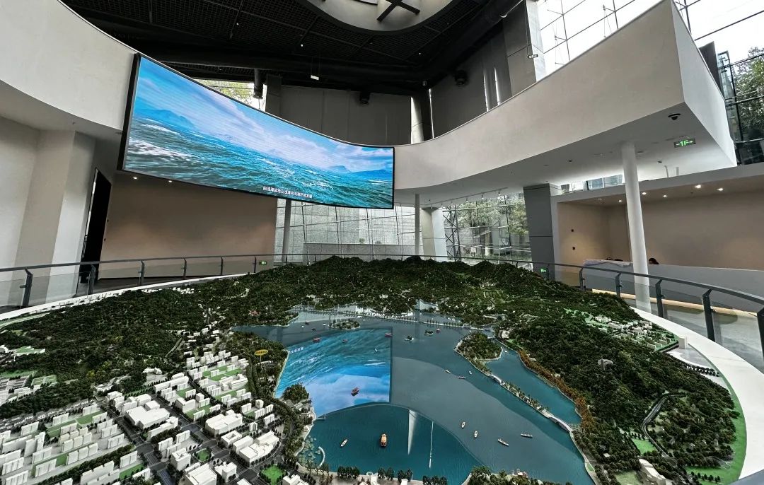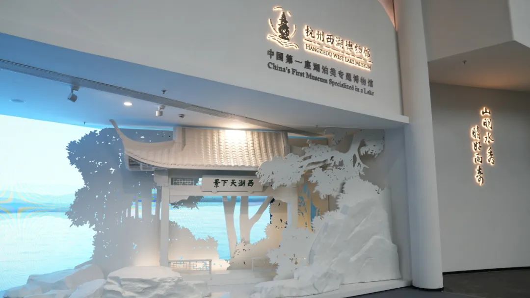 相比以前的大厅,如今在整体氛围设计上,馆内都进行了一次大升级。在序厅入口,是一块流线型的大屏幕,播放着西湖美景的视频动画。在一旁,是孤山西湖天下景亭的造型。置身其中,就仿若来到了西湖边,让人静静品赏。