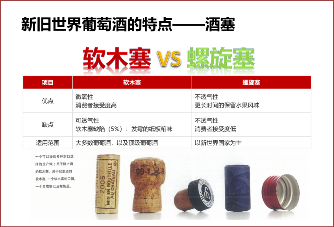 软木塞大家都已经很熟悉了,大部分葡萄酒使用的都是软木塞。目前螺旋塞葡萄酒也逐渐走进了中国消费者的视野。螺旋塞主要应用于新世界国家葡萄酒,尤其是新西兰、澳大利亚和美国葡萄酒。软木塞和螺旋塞各有优劣,从饮酒人的内心世界来说软木塞可能代表的是一种信仰,就像提到旧上海一定想到留声机和上海舞厅的靡靡之音一样,提到葡萄酒就一定会想到软木塞。对于这样的饮酒人来说软木塞是一种情结,如果愿意的话也希望多尝试一些螺旋塞的葡萄酒,在靡靡之音与好莱坞之间大胆穿梭。