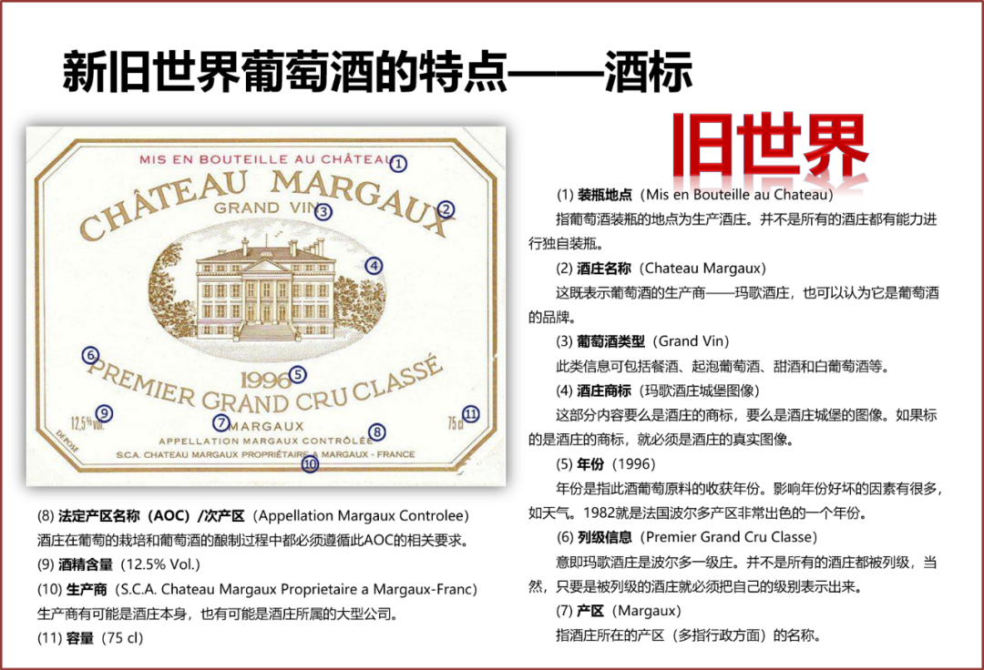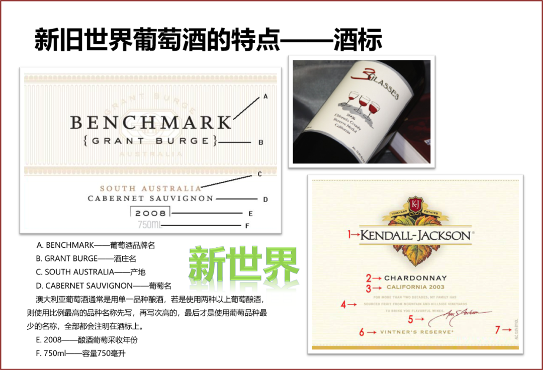 葡萄酒新旧世界的酒标就像中国的旗袍和欧美的衬衫牛仔一样,一个传统、优雅、做工复杂,一个简洁、大方、一目了然。旧世界国家的酒标多以原产地(产区或村庄)命名,酒标所含信息非常多,并且多是使用本国语言,新世界酒标一般以品种或品牌命名,多使用英语。看看下面这两张图就明白了。