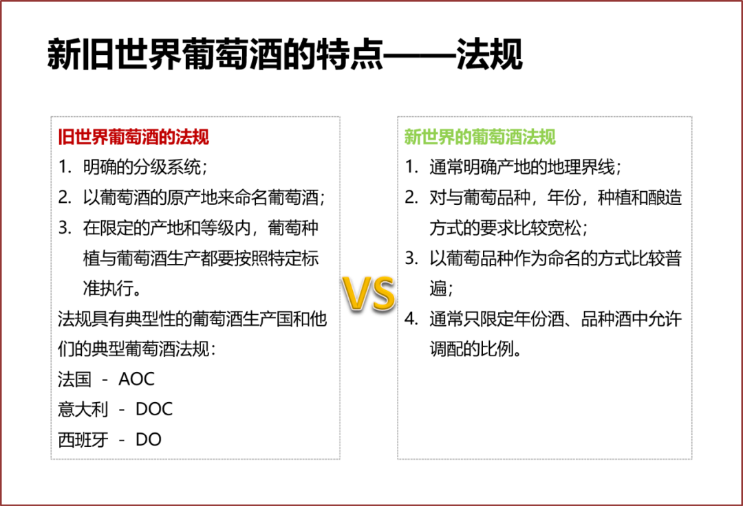 新旧世界葡萄酒法规的对抗就像两代人的江湖规矩不同一样,旧世界对葡萄酒有许多法规进行约束,而新世界就相对来说更宽松一些。