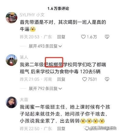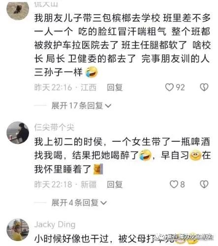 我朋友儿子带三包槟榔去学校班里,差不多一人一个,吃的脸红冒汗喘粗气,整个班都被救护车拉医院去了。班主任腿都软了,啥校长、局长、卫健委的都去了,完事朋友训得跟三孙子一样……