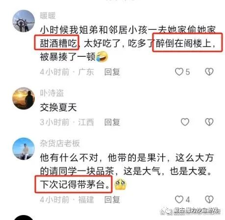与小明的同学家长不谋而合的是广大网友。他们要么诙谐调侃、要么分享自己小时候的经历,俨然醉意正浓。