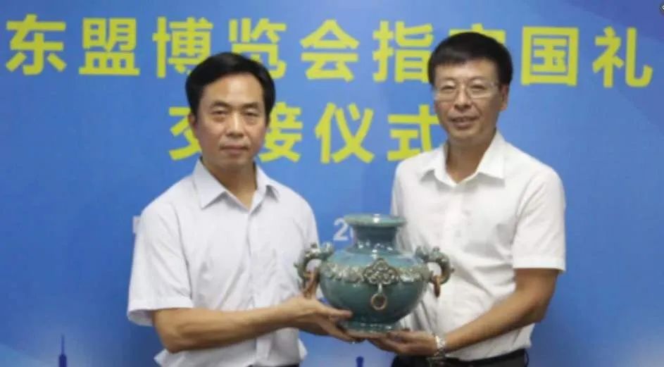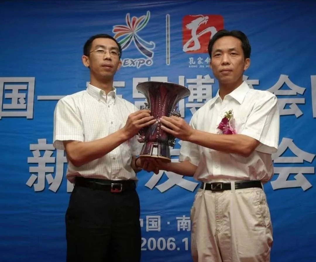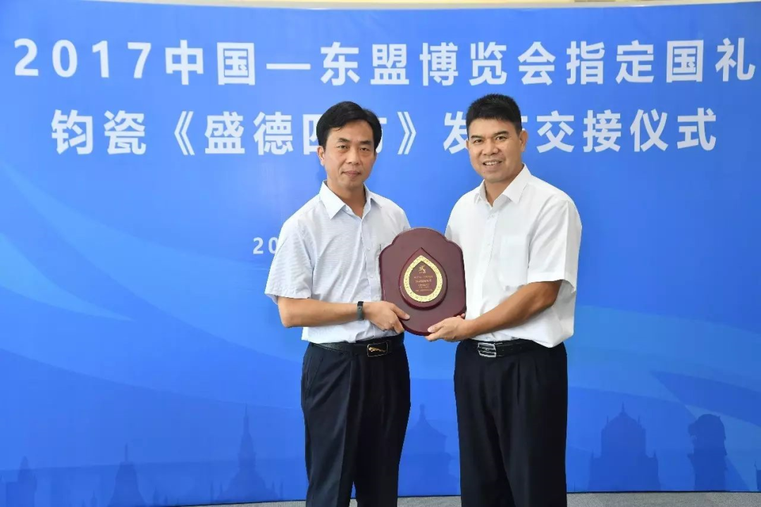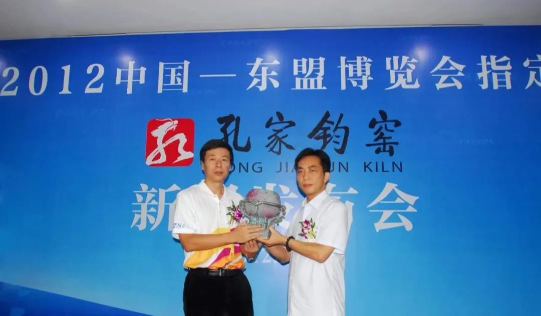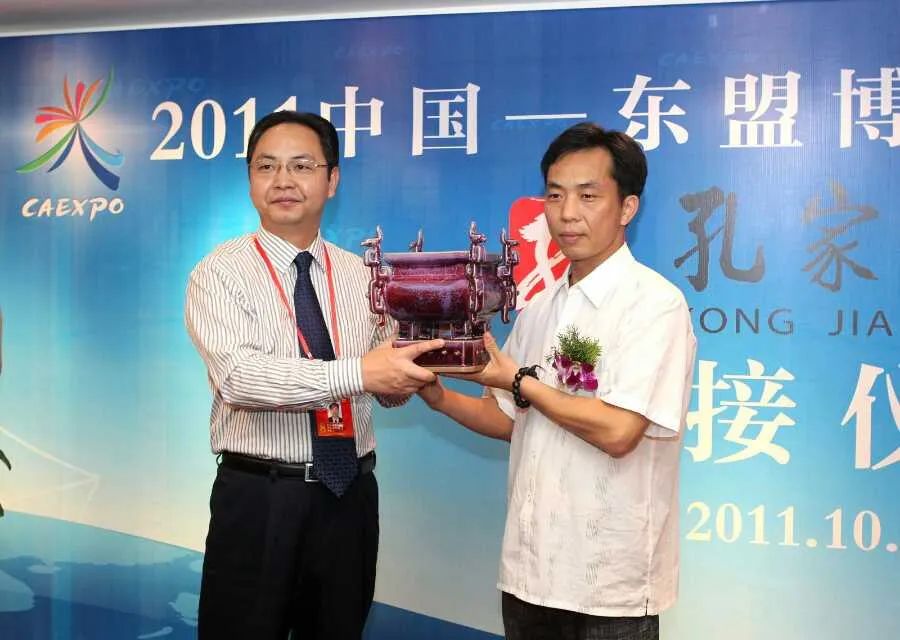 这是孔家钧窑连续15年获此殊荣。中国-东盟博览会秘书处秘书长王雷、副秘书长范隆海出席交接仪式,王雷秘书长向孔家钧窑总经理孔春生颁发荣誉牌匾。