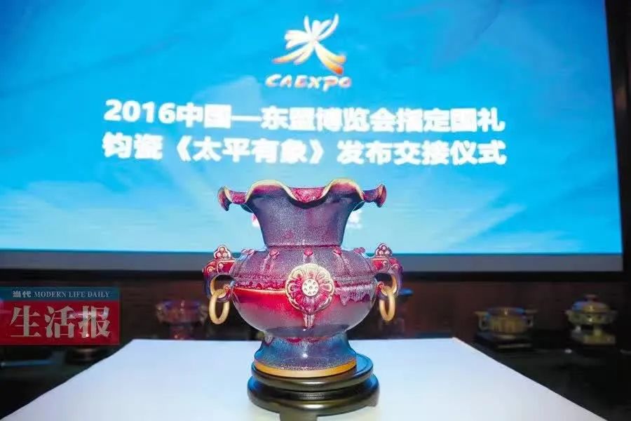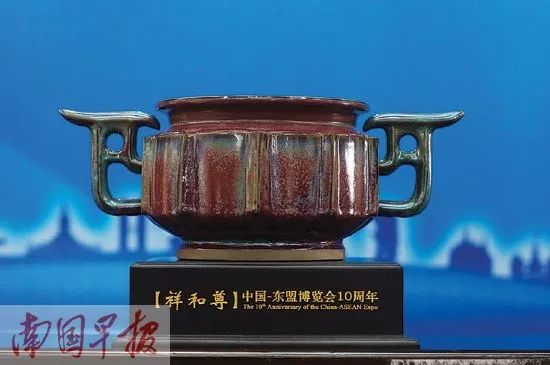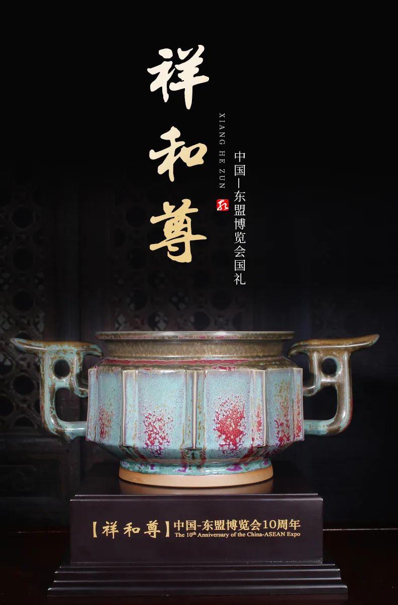 以手工制作的《祥和尊》,整体造型简约端庄,采用钧瓷独特的高铁胎质,运用重还原气氛高温烧制而成。在本届博览会上,《祥和尊》将作为中国与东盟国家的友好使者,把独具特色的中国民族文化向世界展示,为博览会增姿添彩。