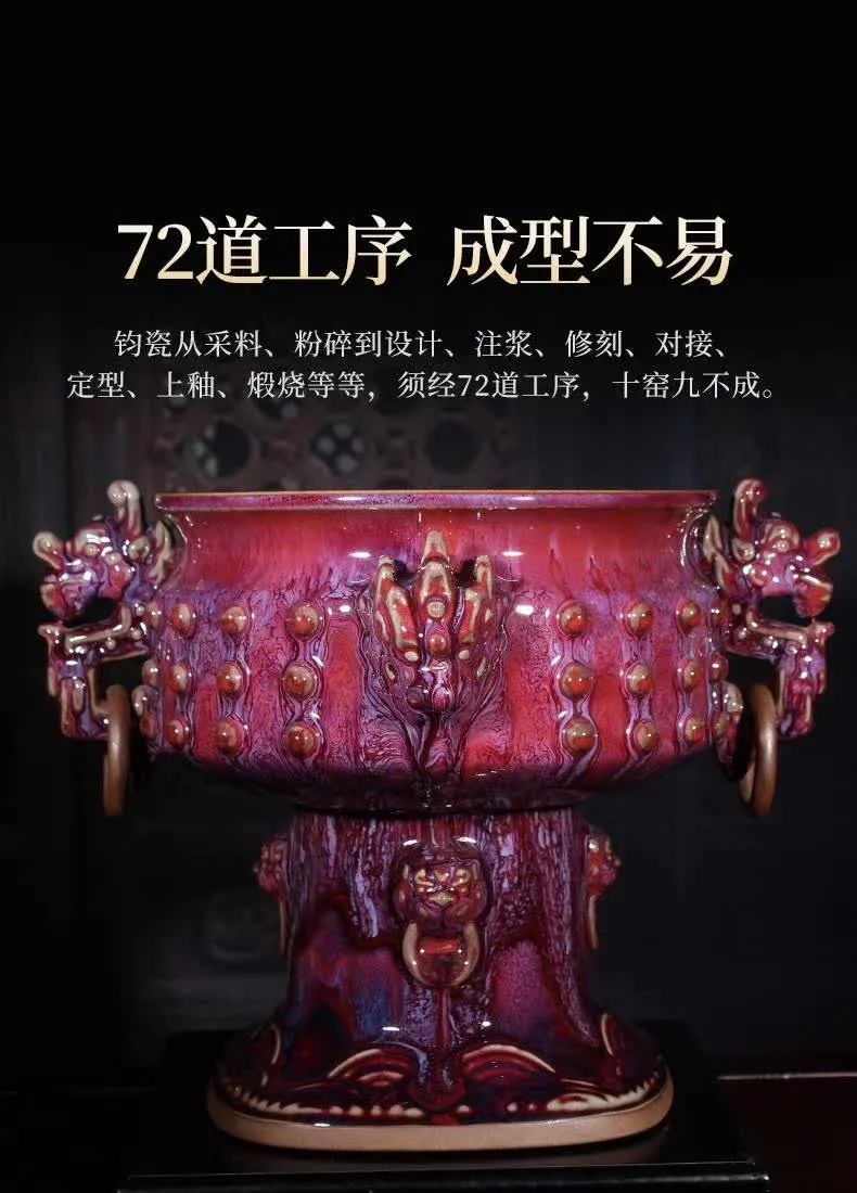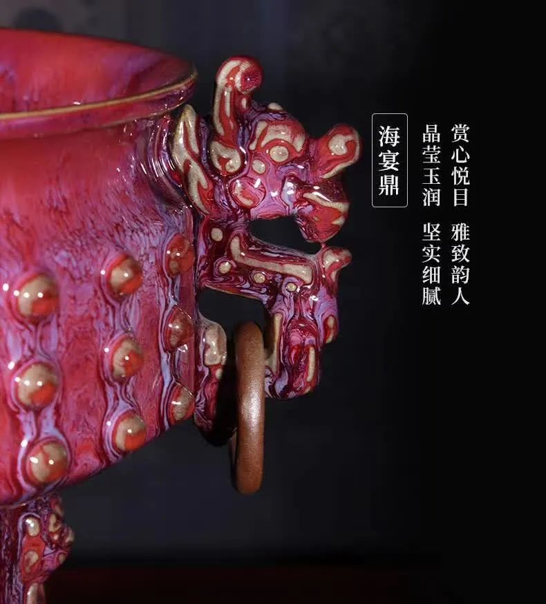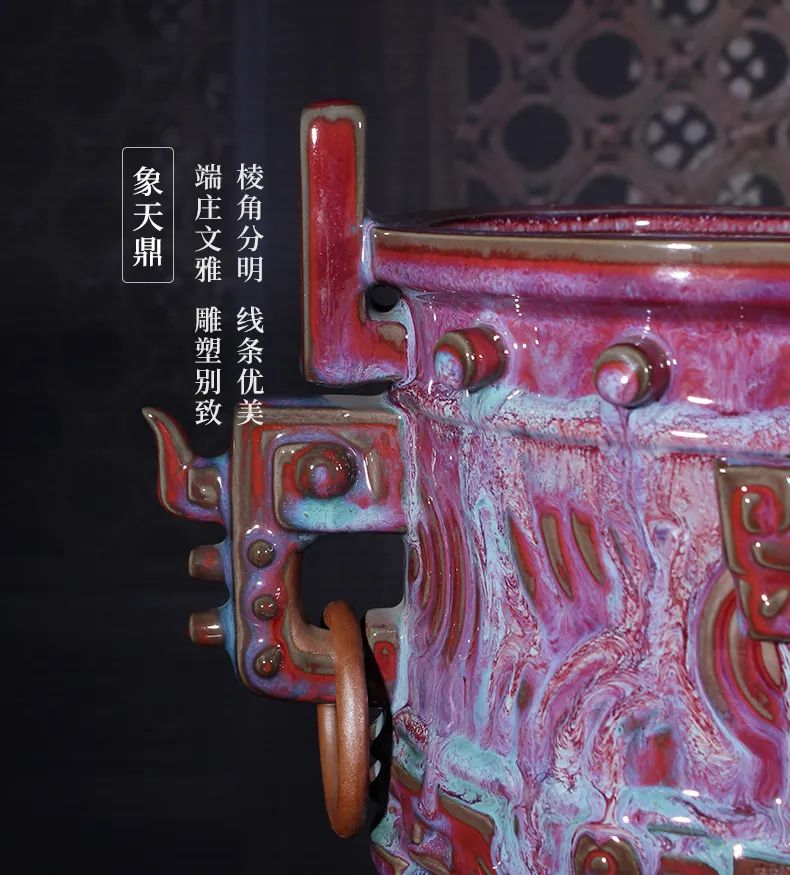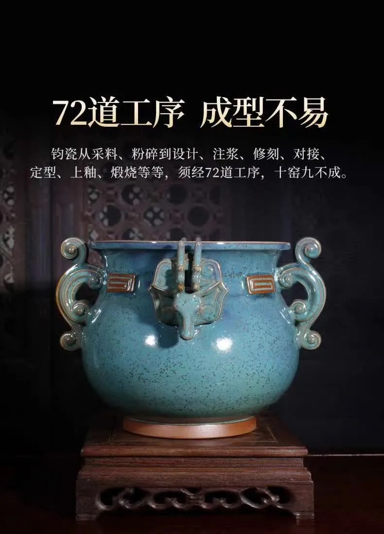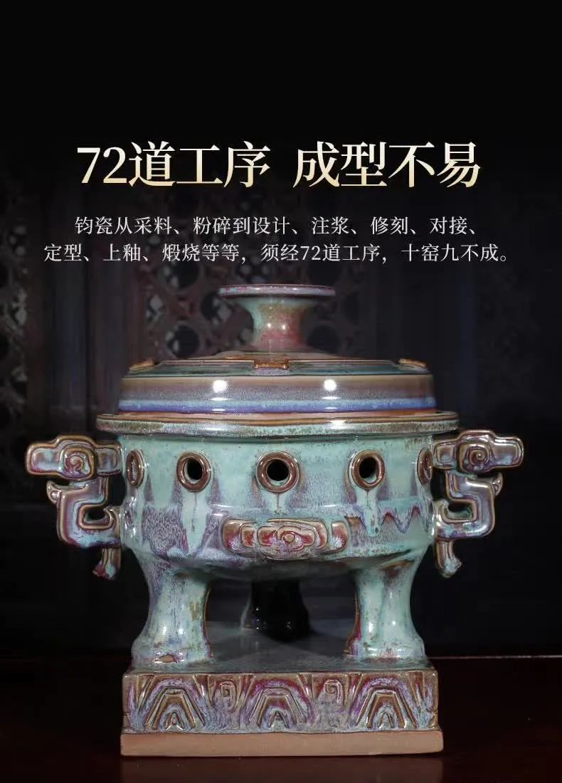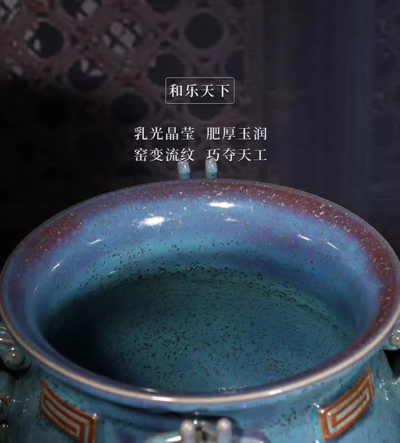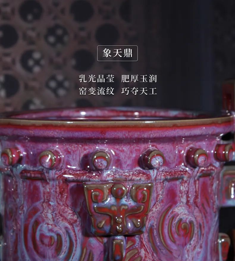 钧瓷位列中国五大名瓷之一,以“入窑一色、出窑万彩” 的自然窑变著称,深刻诠释了道法自然的精神。象天鼎,以中国最古老的艺术造型——鼎,传播博大精深的传统文化。