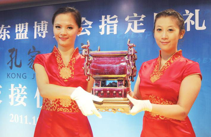 『丰』尊,第三届中国-东盟博览会国礼,以中国古老礼器青铜尊为基本造型设计制作,圆口方底,象征天圆地方,表达对四方宾客的恭敬。腹部15个乳钉纹纽,与中国-东盟建立对话关系15周年相吻合;腰部三个龙形耳饰,代表同时期举办的中国-东盟博览会和第三届中国-东盟商务与投资峰会;颈部的11个凤尾状丰收纹,寓意11国友好、发展、繁荣。用中国历史上两个最大的图腾崇拜龙和凤作饰物,表示中国和东盟10国和平、和谐、合作,象征中国与与东盟10国共同发展、共同繁荣。整个礼器造型端庄、底蕴浑厚、工艺精美。日线了雍容华贵、典雅大气的艺术风格。