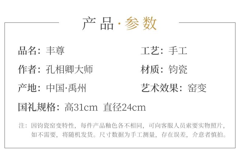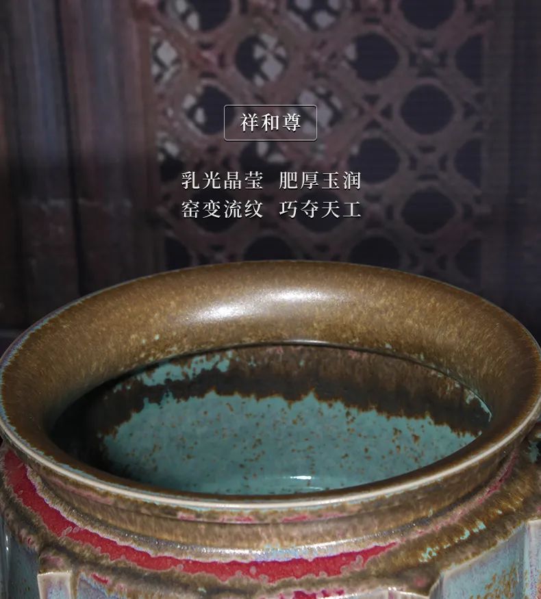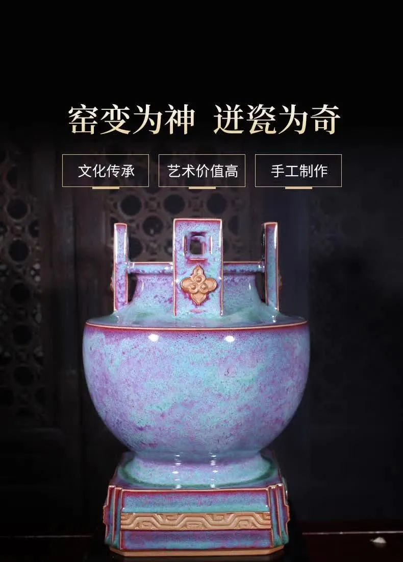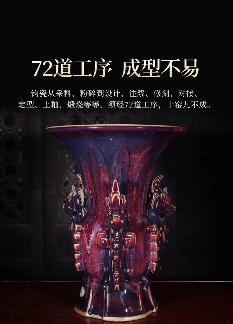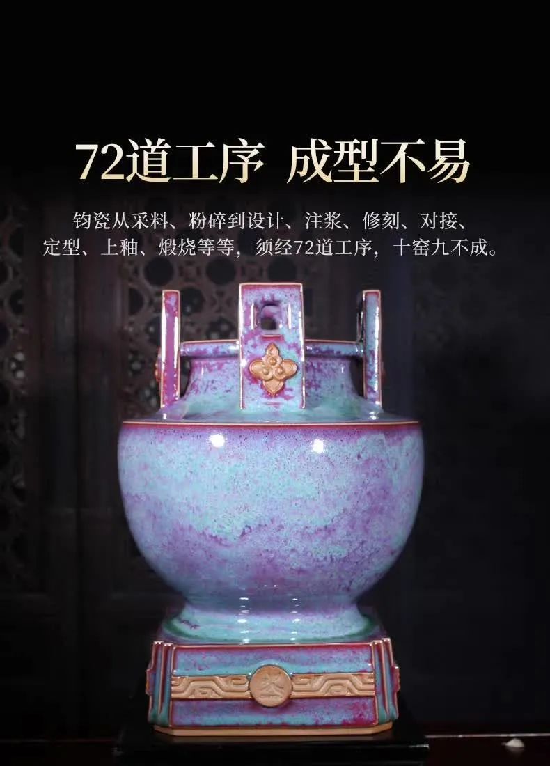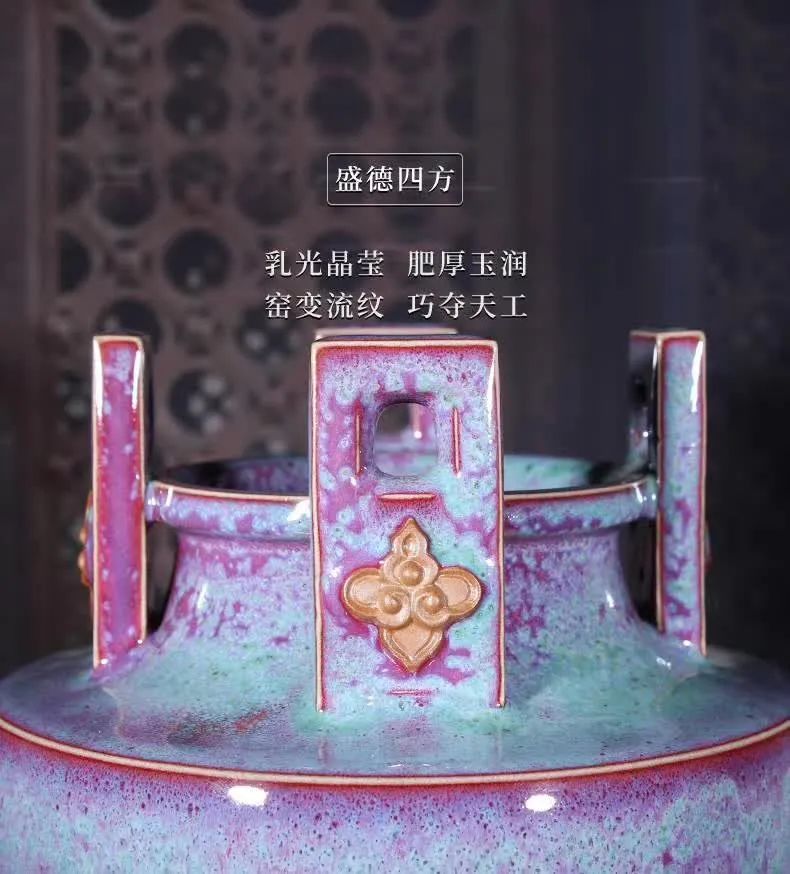 其造型端庄大气,纹饰典雅精美,釉色高贵华美,釉质莹润如玉。尤其是幻化万千、浑然天成的无双“窑变”,演绎了钧瓷“神、奇、绝、妙”的独特魅力和“天人合一”的至高审美。
