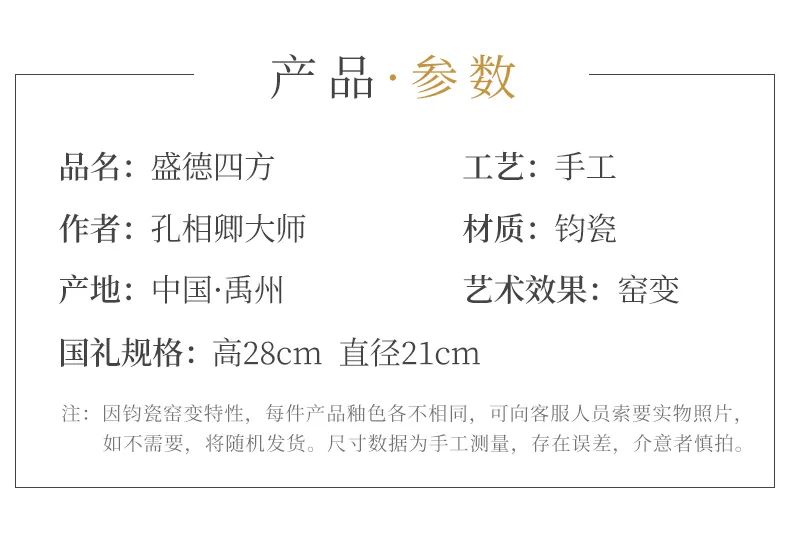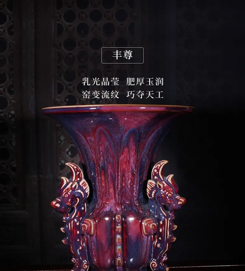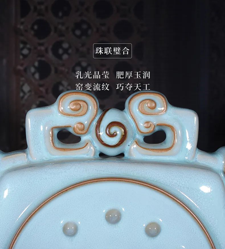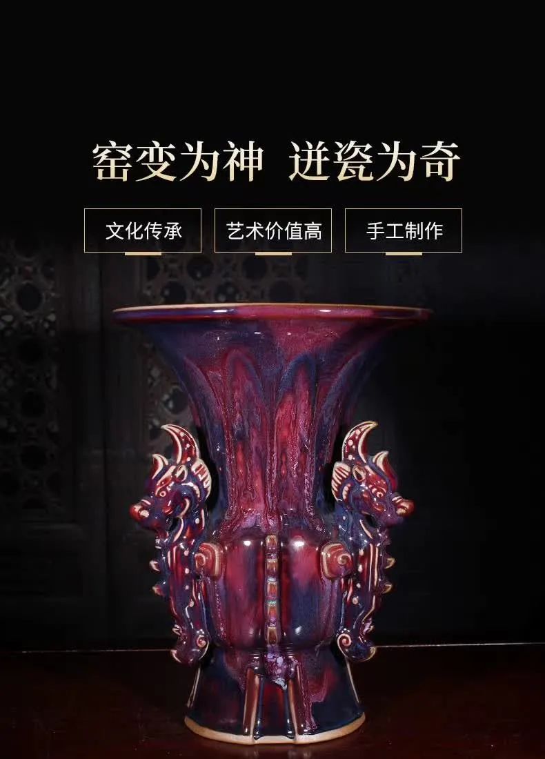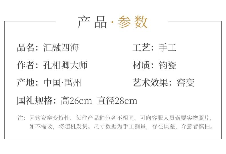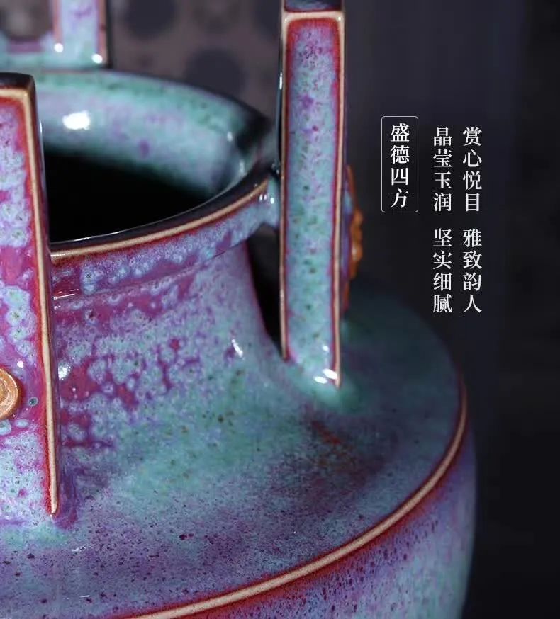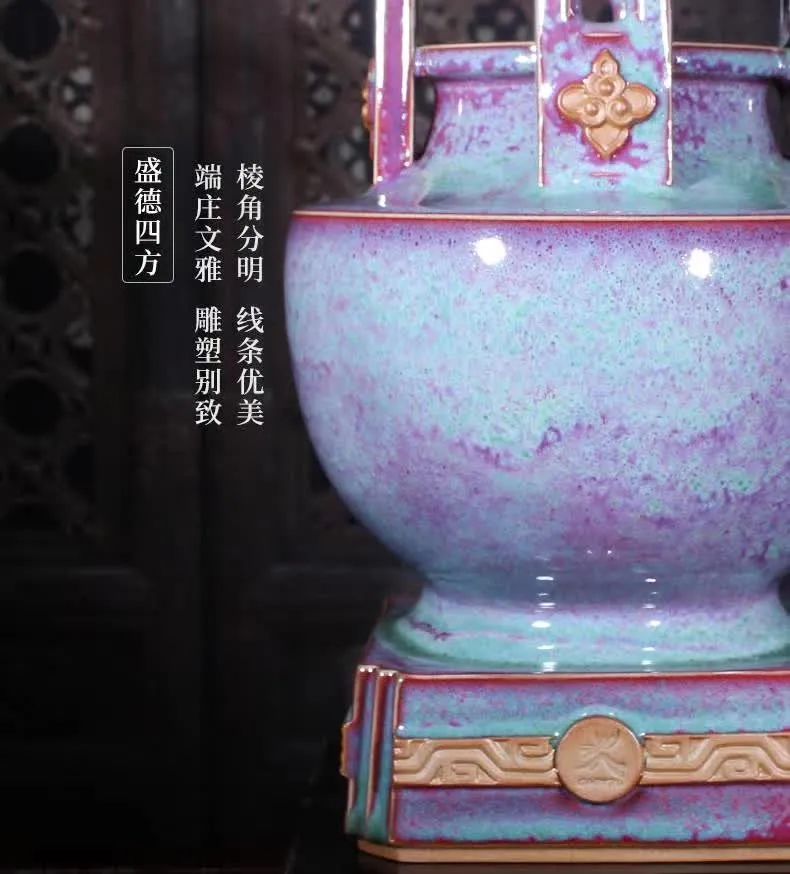 其造型端庄大气,纹饰典雅精美,釉色高贵华美,釉质莹润如玉。尤其是幻化万千、浑然天成的无双“窑变”,演绎了钧瓷“神、奇、绝、妙”的独特魅力和“天人合一”的至高审美。