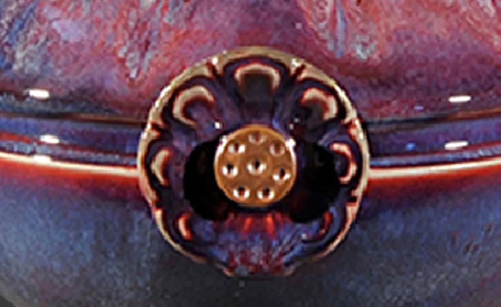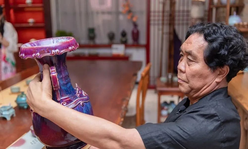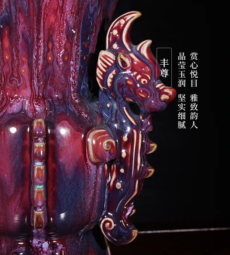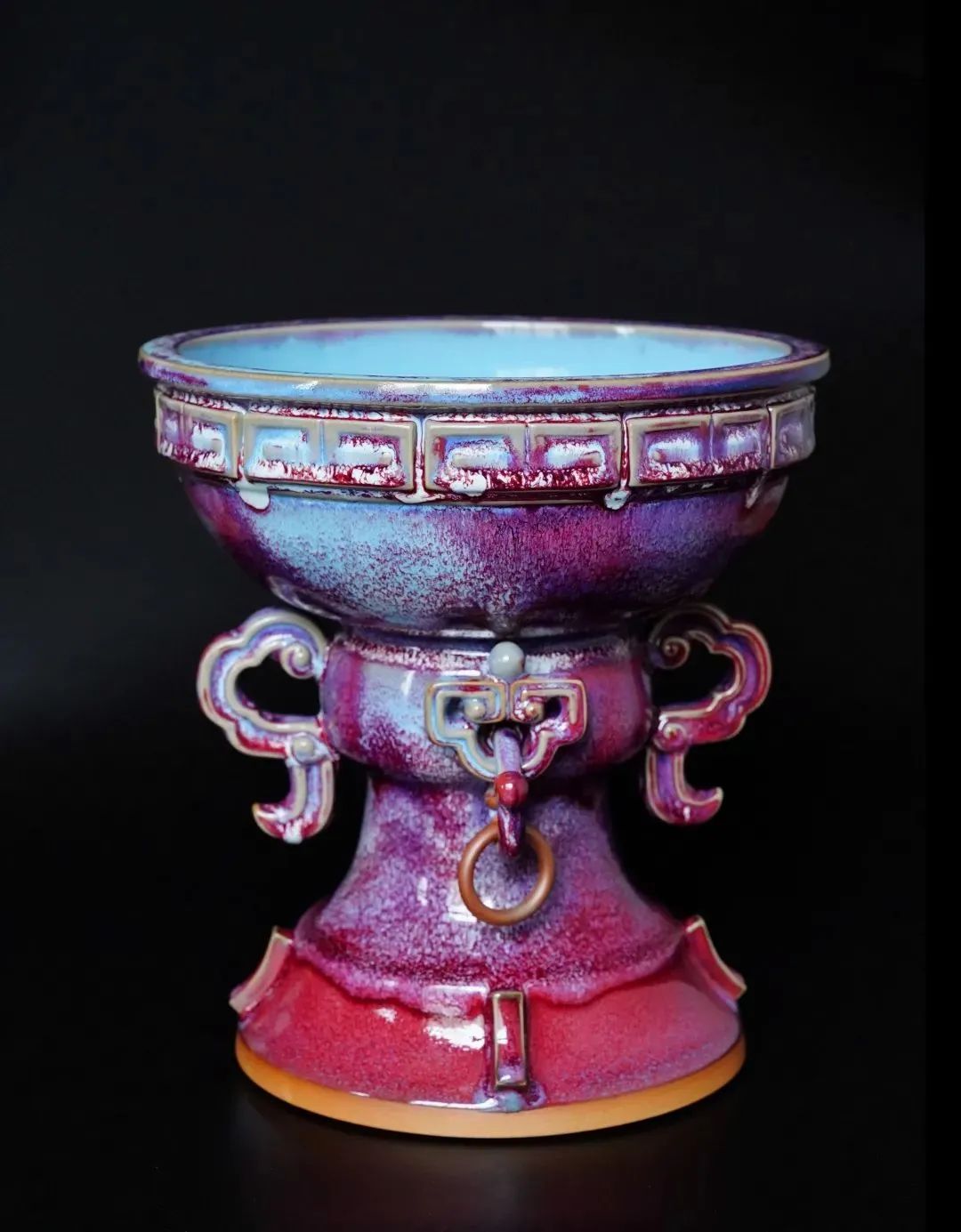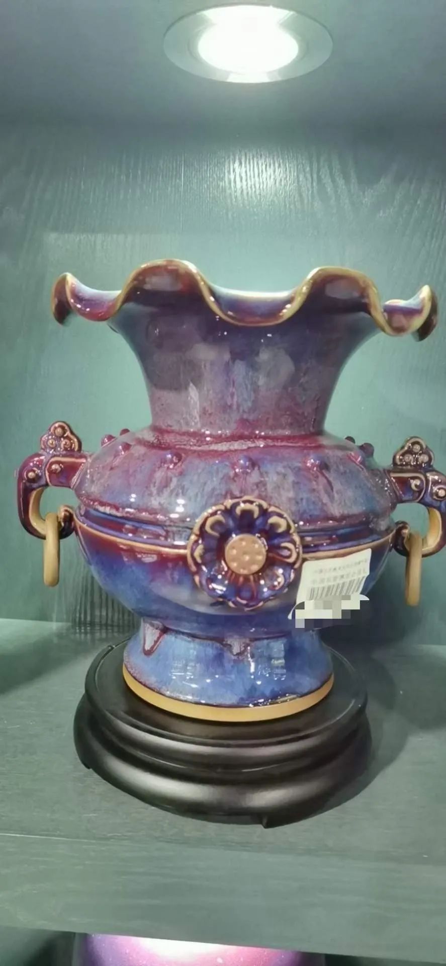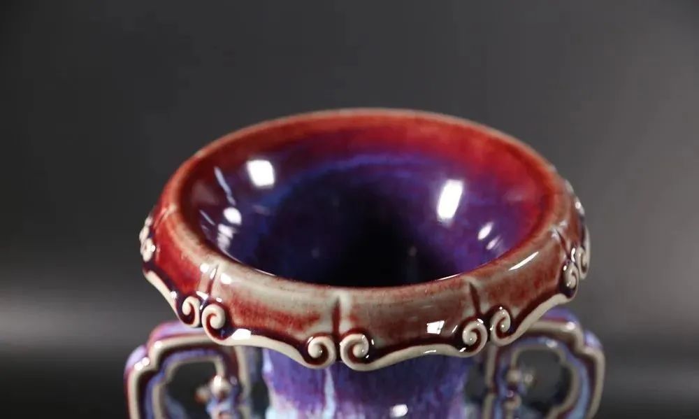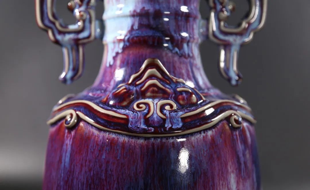 《泰和尊》通体施以“玫瑰紫釉”。钧瓷讲究“红为尊、紫为贵,天青月白赛翡翠”,在钧瓷所有釉色中,玫瑰紫釉是高温铜红釉中的一个名贵品种,该作品整体纹饰典雅精致,釉色神奇绝妙,文化内涵深厚,为一尊难得一见的珍品佳作。