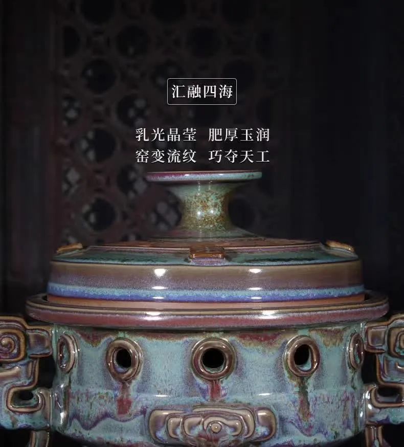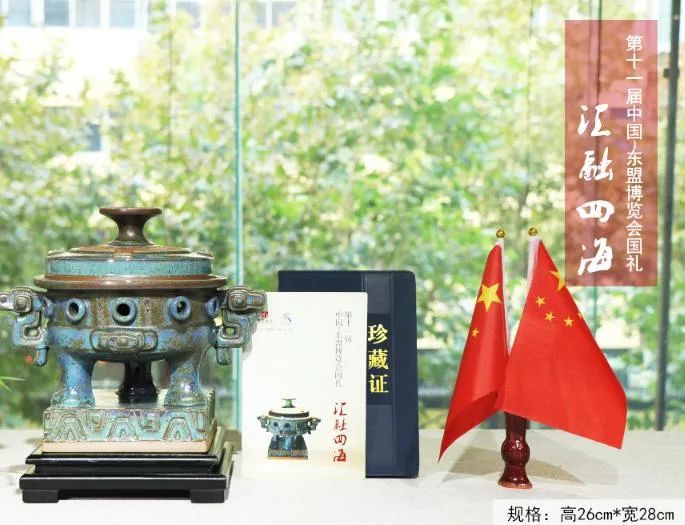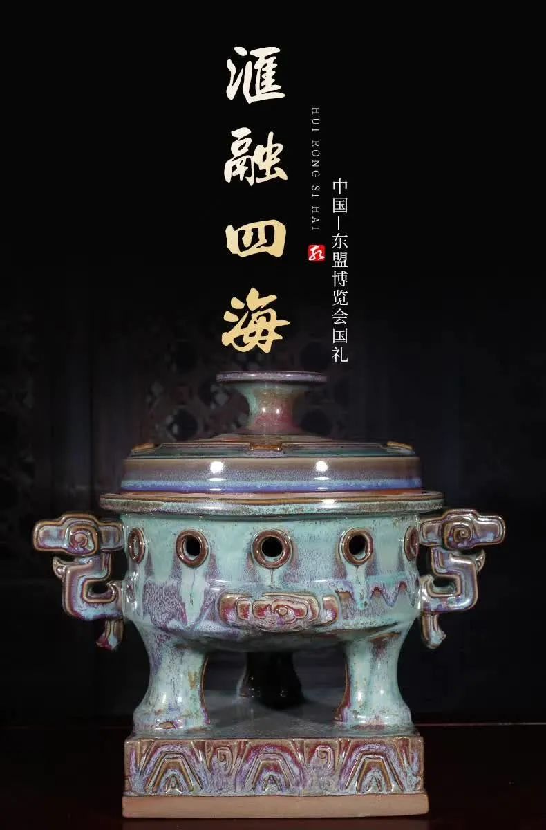 国礼《汇融四海》,以中国古老的礼器香炉为基本造型,顶部为镂空祥云纹样,两侧装饰一对如意祥云耳饰,周围分布11个圆孔,象征中国—东盟召开第十一届博览会。三足挺拔俊秀,底座饰以海浪纹,不施釉,独具古朴苍劲之美。釉色五彩缤纷、错综掩映,为自然窑变而成,乳光莹润的光泽,赋予国礼雍容博大的气韵。