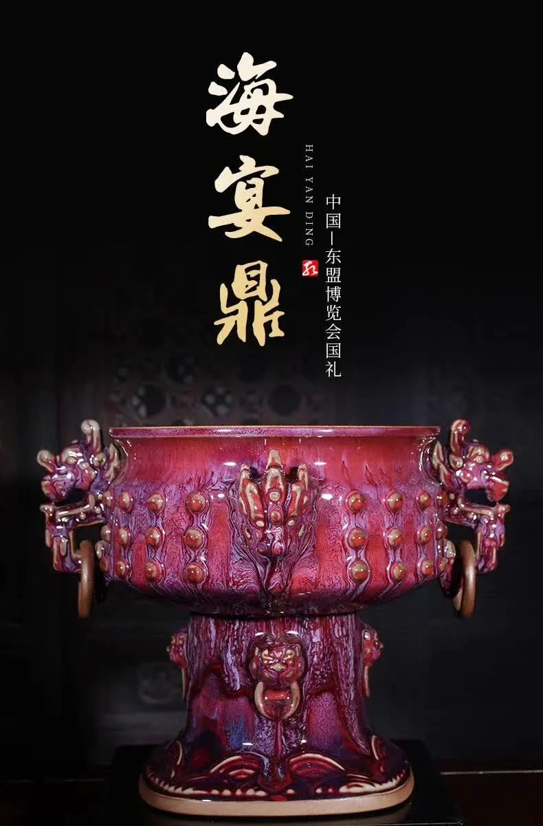 国礼钧瓷《海宴鼎》,秉承宋钧神韵,风格雍容尊贵、典雅大气。它以中国古老的青铜礼器“鼎”为基本造型设计制作,上部四个龙形浮雕,象征第四届中国—东盟博览会和第四届中国—东盟商务与投资峰会。四个龙雕之间,装饰着四组乳钉,每组三排12枚,象征着十二地支,以中国传统纪年法寓意中国—东盟博览会举办四年来,取得的丰硕成果。中部装饰四个虎形铺首,在中国传统文化中,龙有自强不息、泽被苍生的品德,而虎虎有生机,虎在民间习俗中驱邪、祈福的含义。龙腾虎跃,生龙活虎,代表中国与东盟10国的发展合作富有生机与朝气。下部的海浪纹,象征着大海波平浪静,点出了《海晏鼎》的主题:繁荣、和谐、发展。钧瓷《海宴鼎》厚重、大气、典雅,充分展现了钧瓷独有的“窑变“艺术魅力,代表了当代陶瓷的最高制作水准,打出了“国礼”的高贵神韵。