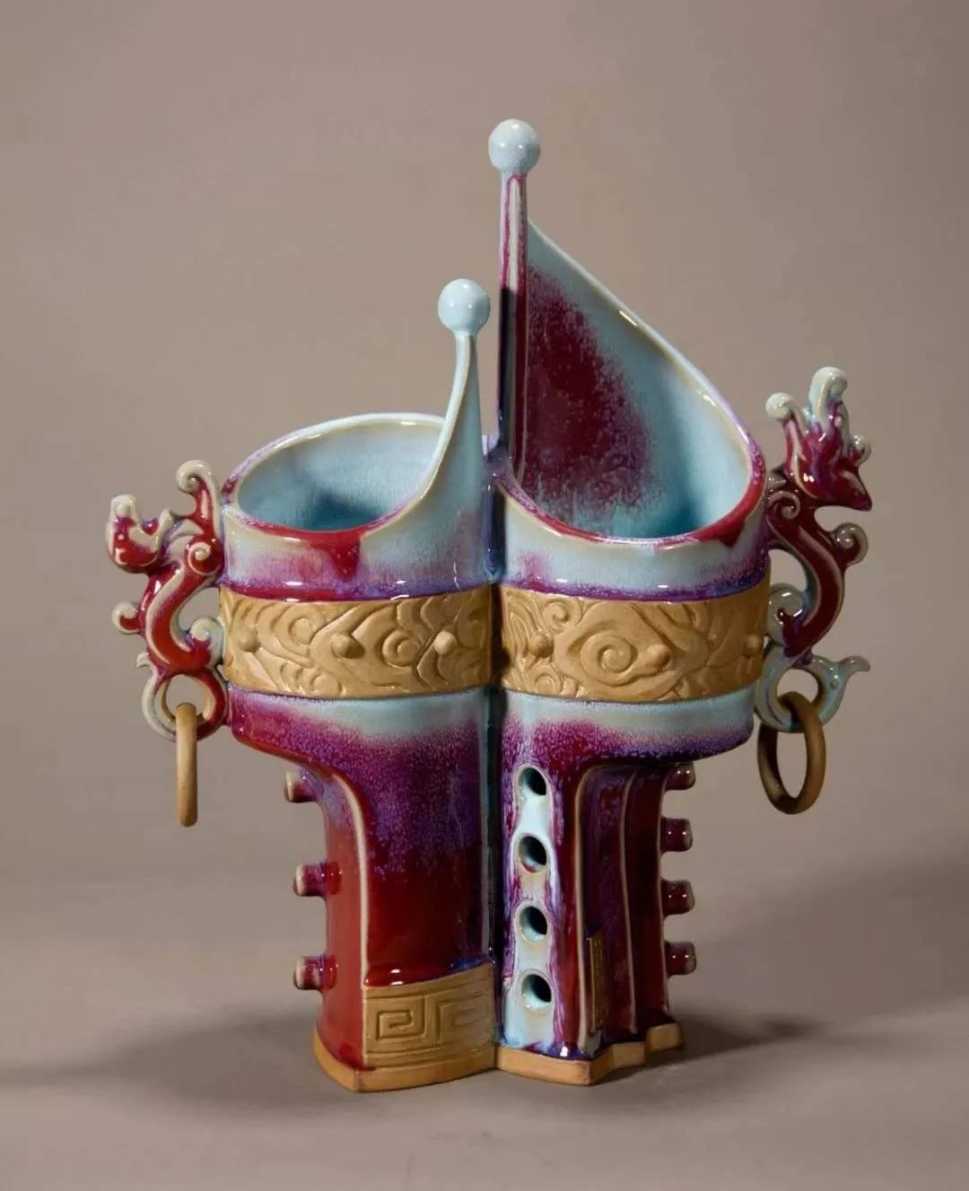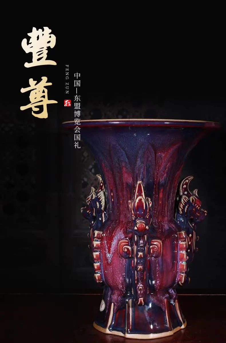 第三届中国-东盟博览会国礼钧瓷《丰尊》,以中国古老的青铜礼器“尊”为基本造型,圆口方底,象征天圆地方,以敬天礼地的传统,表达对四方宾客的绵绵尊敬和谦谦后礼。设计者希望通过这样一个巧妙的构思来表达中国与东盟十国人民互利合作、共享繁荣美好未来,让接受国礼的各国贵宾可以直接感受到中国民族传统文化的魅力。