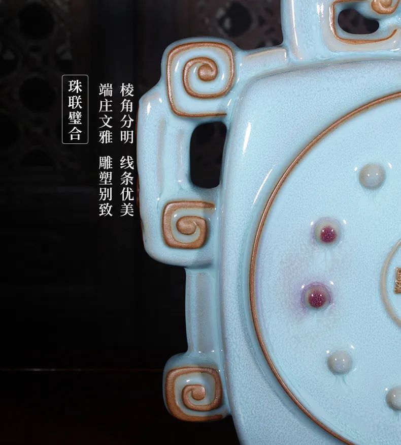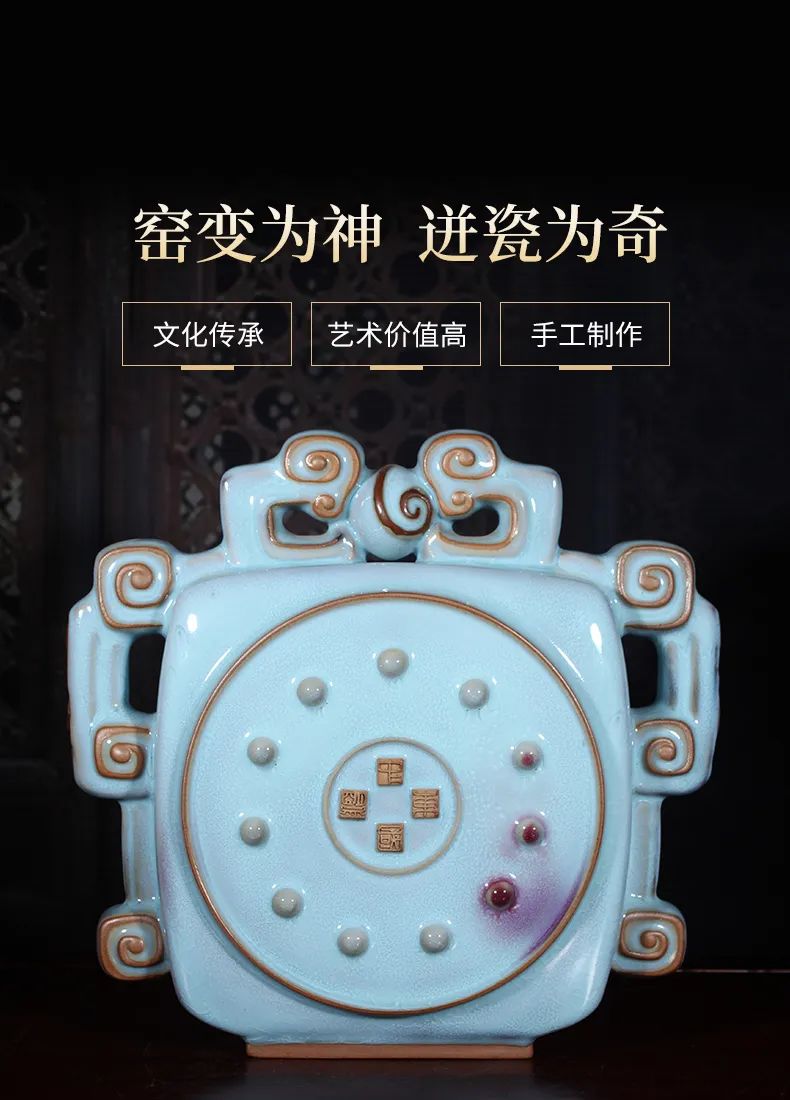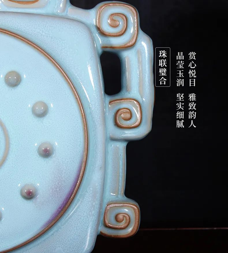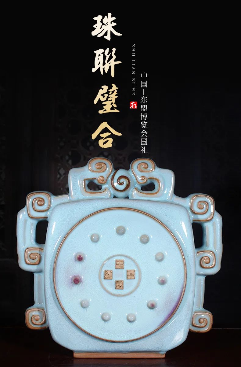 钧瓷“珠联璧合”由中国工艺美术大师孔相卿设计,以中国上古礼器玉璧为基本造型,玉璧上11枚乳丁环绕一周,等距排列,象征中国与东盟10国合作共赢携手发展。