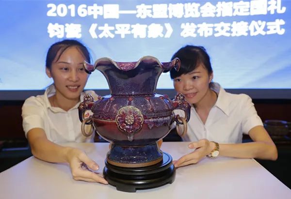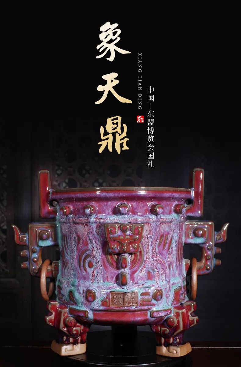 钧瓷珍品《象天鼎》被选定为第五届中国—东盟博览会国礼。它造型端庄大气、文饰典雅精致,窑变釉色高贵华美,是当代中国艺术陶瓷中的珍品。它以中国古老的青铜礼器“鼎”为基本造型设计制作。两个象形耳饰,与三个鼎足的象形加在一起为“五”。五象寓意第五届中国—东盟博览会和第五届中国—东盟商务与投资峰会将会给这片土地带来长久的繁荣,三个象足又代表第三届中国—东盟电信周。鼎腹装饰有祥云浅浮雕,下部装饰有青鸟图案,中间为“中国东盟、五”铭文。祥云萦绕与青鸟飞翔的天空,代表着中国与东盟10国通过中国—东盟博览会搭建的平台沟通与交流,和谐发展、共生共荣、繁荣昌盛。
