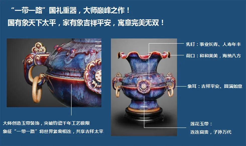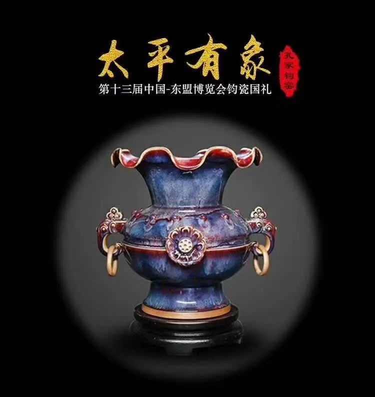 钧瓷《太平有象》通过蓝色窑变和独具匠心的玉带、莲花等装饰,完美体现“共建海上丝绸之路,共筑更紧密的中国—东盟命运共同体”的东博会主题,更深度融入了中华民族的文化与艺术传承。