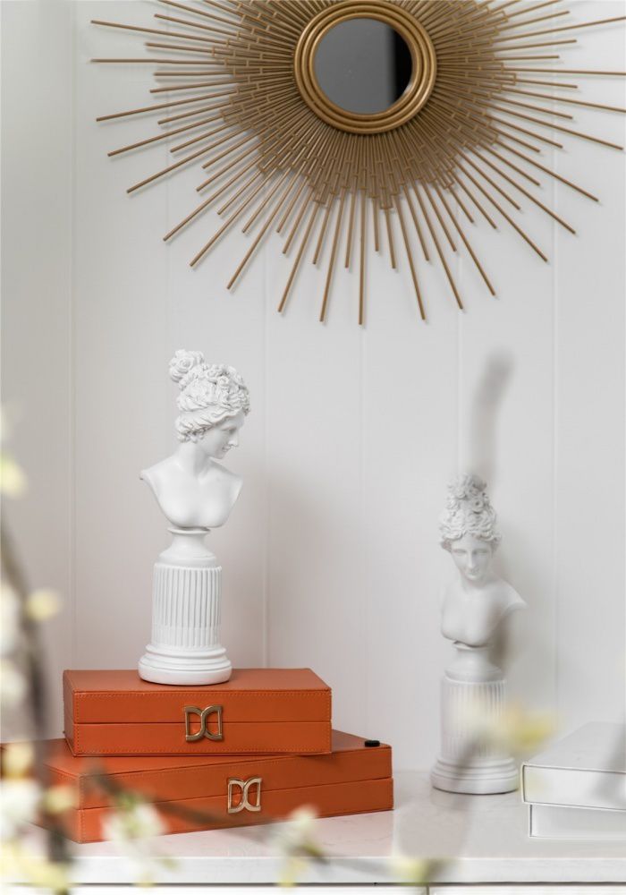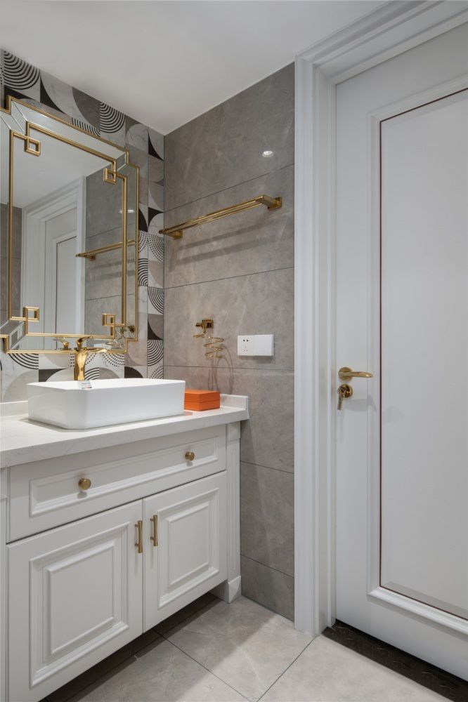 ▲ 卫生间,金边镜子更添一份精致之感,配以后方拼接组合的艺术瓷砖,给人一种无法抗拒的美感。