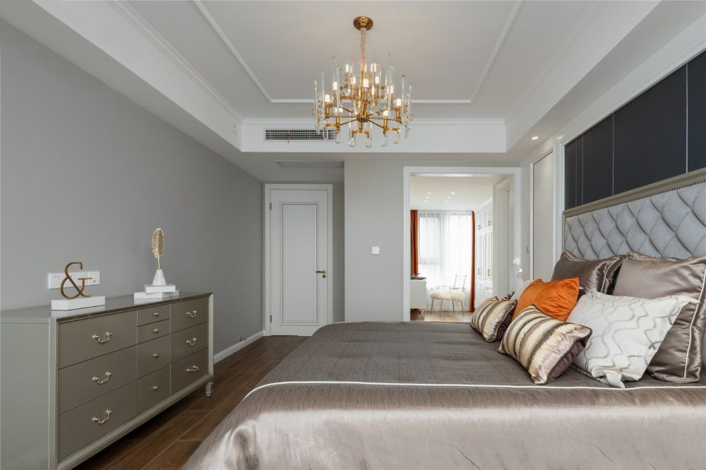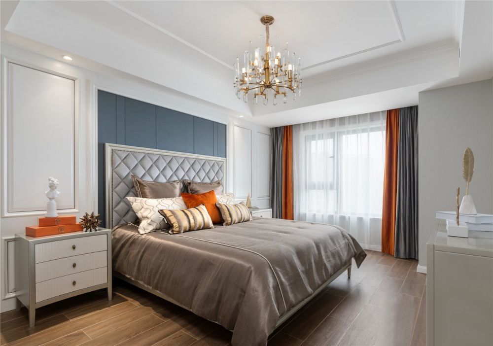 ▲ 主卧以灰白两色为空间基调,床头背景墙加入静谧内敛的灰蓝色,沉静而优雅。运用爱马仕橙将奢华氛围带入,成为空间的点睛之笔。