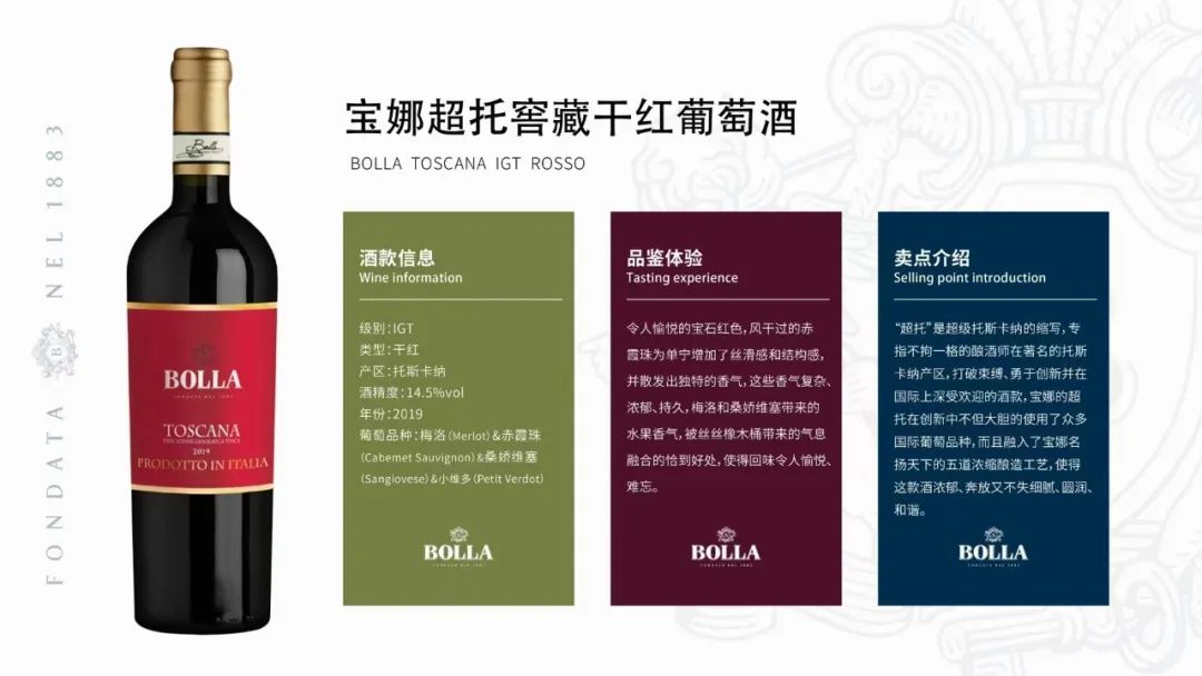 令人愉悦的宝石红色,风干过的赤霞珠为单宁增加了丝滑感和结构感,并散发出独特的香气,这些香气复杂、浓郁、持久,梅洛和桑娇维塞带来的水果香气,被丝丝橡木桶带来的气息融合得恰到好处,使得回味令人愉悦、难忘。