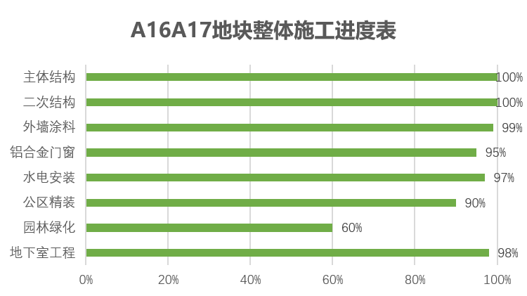 主体结构完成100%,二次结构完成100%,外墙涂料完成99%,铝合金门窗完成95%,水电安装完成97%,公区精装完成90%,地下室机电完成98%,电梯安装完成100%,园林绿化完成60%。
