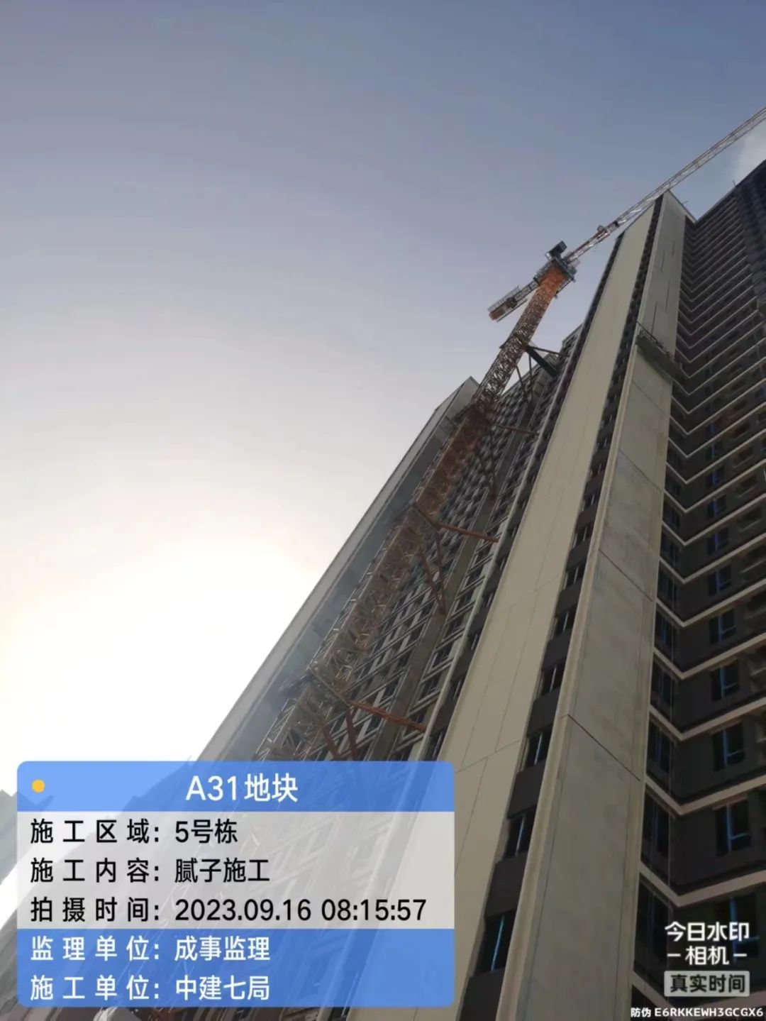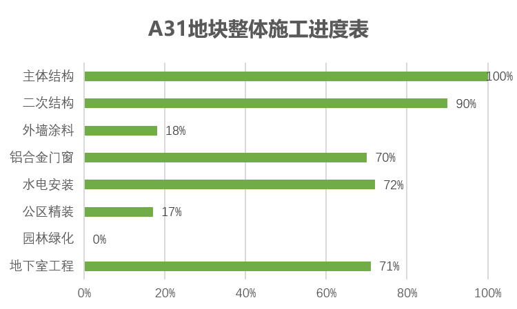 主体结构完成100%;二次结构完成90%;外墙涂料完成18%,铝合金门窗整体完成70%;水电安装完成72%;公区精装完成17%,地下室工程完成71%。