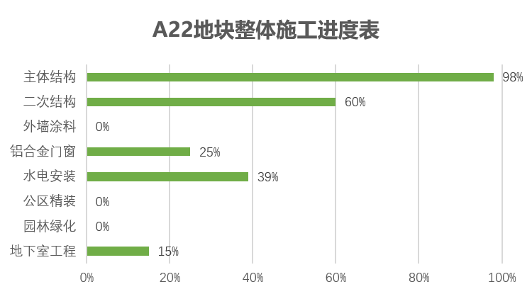 主体结构完成98%、二次结构完成60%、水电安装完成39%、地下室工程完成15%,栏杆完成12%、门窗完成30%、消防完成4%。