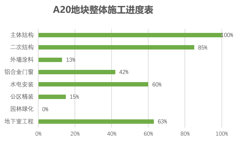 主体结构完成100%;二次结构完成85%(砌筑完成99%;抹灰完成99%;保温完成51%),铝合金门窗、栏杆完成42%;水电安装完成60%;地下室工程完成63%,公区装修完成15%,外墙涂料完成13%。