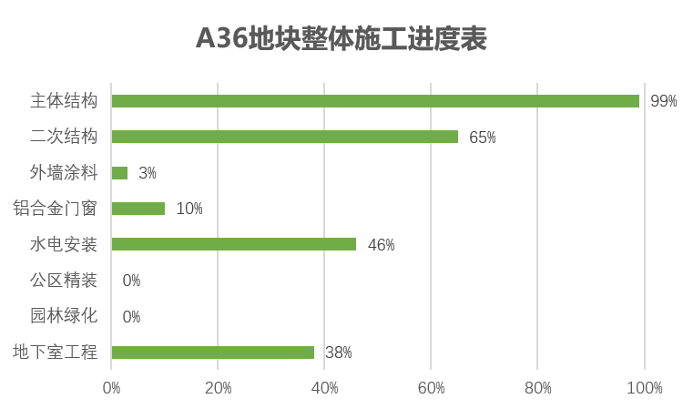 主体结构完成99%;二次结构完成65%;水电安装完成46%;锌钢栏杆安装30%;地下室工程完成38%;外墙完成3%,铝合金门窗安装完成10%(其中窗框完成30%)。