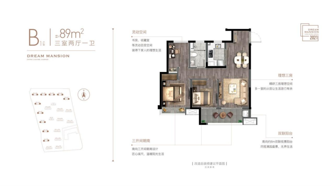 金悦学府建筑面积约89㎡三房两厅一卫布局,在77㎡基础上,增加过度玄关,预留更多收纳空间同时,有效提升居家生活仪式感。真正意义将平面收纳升级为空间收纳,有效利用家里的每一个角落。