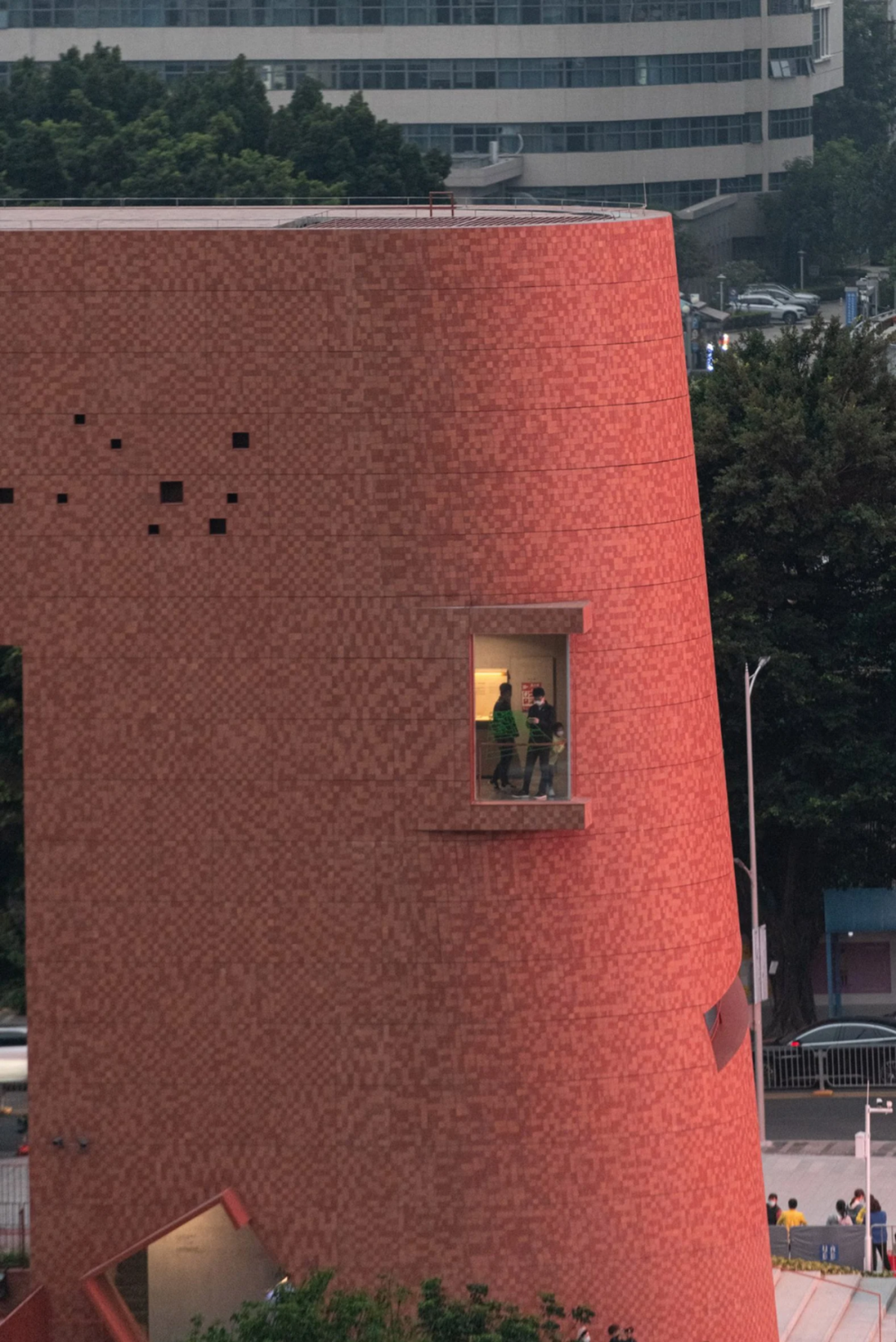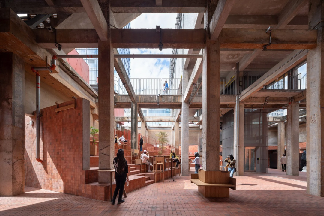 项目中央,废水池和曝气池在拆除后露出原有的混凝土框架,顶部用金属和赤陶色的瓷砖装饰出一个展览空间。