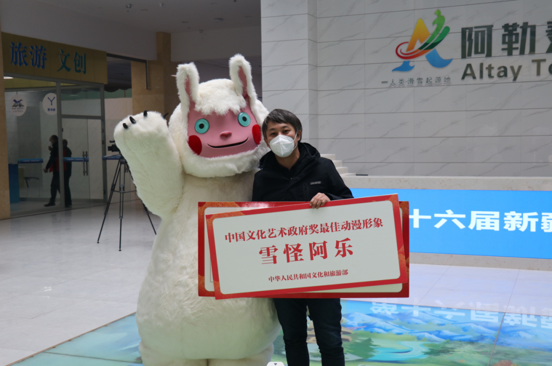阿尔斯别克·努汉与他设计的动漫形象“雪怪阿乐”