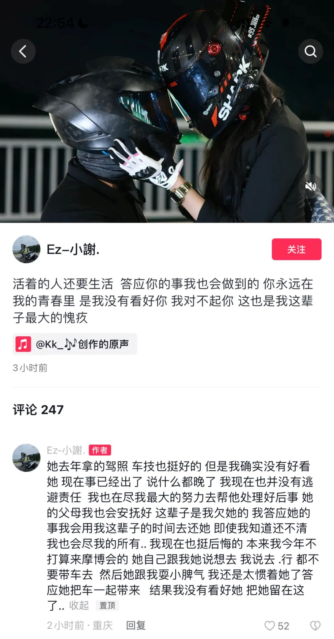 事故发生后疑似她的男友发文表示十分后悔带她来参加摩博会。表达了对@头哥 的愧疚: