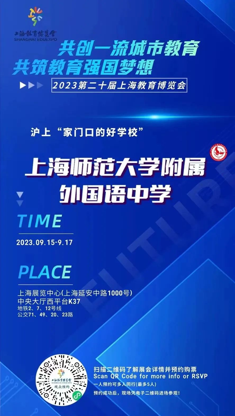 9月15日,2023第二十届上海教育博览会在上海展览中心开幕,通过线上线下集中展示、研讨会、教育大直播等方式,展示上海教育改革发展成果以及各高校、区域、学校的经验成果和生动案例。上海师范大学附属外国语中学在沪上“家门口的好学校”主展区隆重亮相!