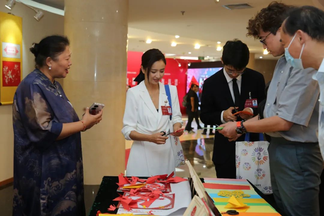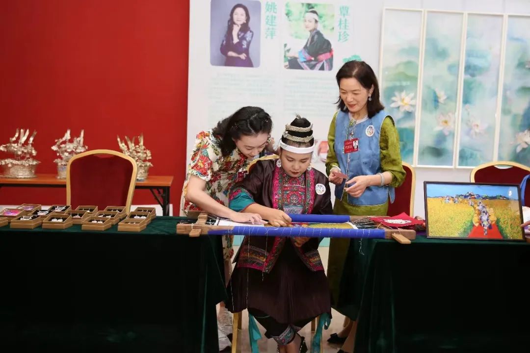 参会代表与中国文艺志愿者协会副主席、苏绣大师姚建萍,文艺志愿者覃桂珍互动体验侗绣项目。