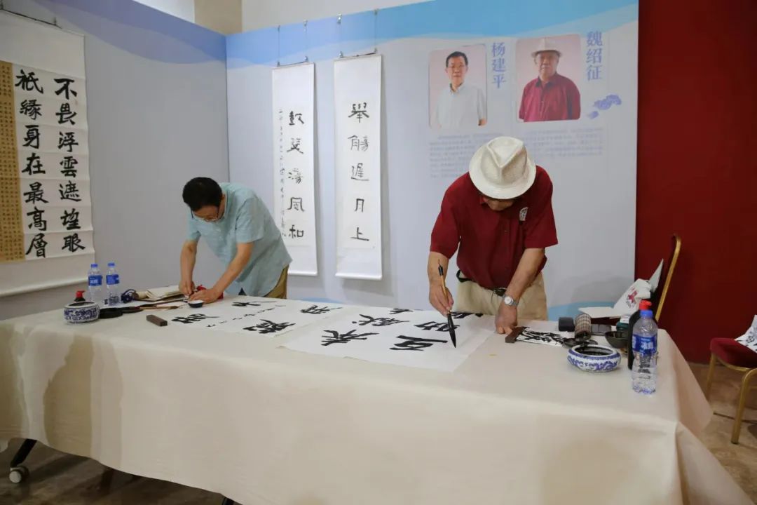 文艺志愿者杨建平、魏绍征为观众展示书法项目。