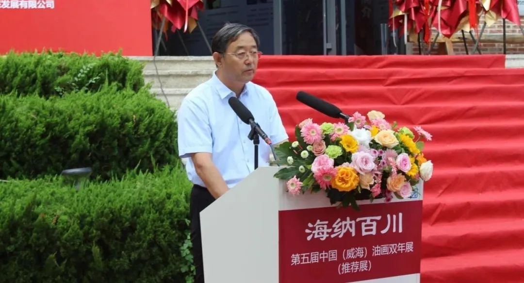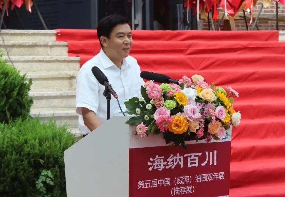 威海市文联党组书记、主席邢飞在致辞中说:“海纳百川——第五届油画双年展的成功举办,无疑是中国油画界一件盛事,更是威海艺术界艺术人的一大喜事。本届双年展延续了2015年以来前四届展览的学术前沿性和研究性,以独特的视角,奔放的情怀,热烈且前卫的色调,泼洒出威海千里海疆的大美之所在。回首双年展近十年留下的一串串坚实而闪光的探索足迹,我们豪情满怀,信心百倍,上下联动,齐心共治,对全力打造中国一流的油画艺术原创基地、一流的中国特色油画小镇,更是信心百倍。祝愿伴随着精致城市·幸福威海建设的大进步,代表着中国油画年度性水准报告的威海油画指数,能够早日在油画大家、名家的共同操持、扶持和鼎力帮助之下,早日在威海诞生,并能迅猛成长,让威海的艺术之城早日走向世界!”