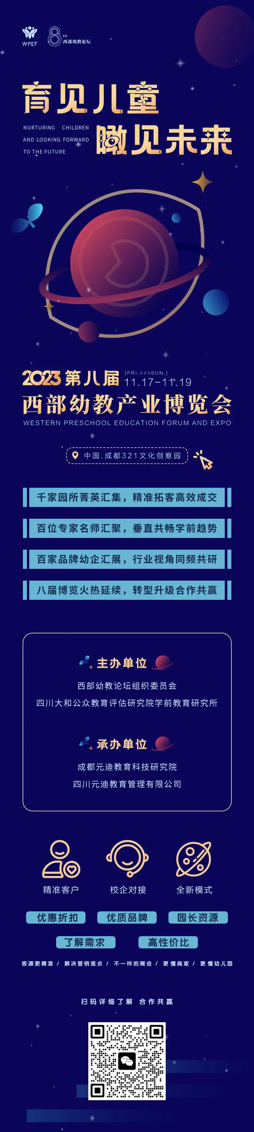 西部幼教产业博览会是一场与万千幼教人直接面对面的盛会,西部园所汇集论坛,确保你精准拓客;同时这也是一场西部幼教界的年度盛宴,西部幼教论坛平台让全国百位名师汇聚,共聊学前发展趋势;并且这是一场论坛、展会、文创交融的盛会,百家品牌幼企汇聚展会,寻找合作共赢未来。第八届西部幼教产业博览会以全新的会展模式、更有效的校企对接,让你真正建构起园所与西部幼教产业沟通的桥梁。