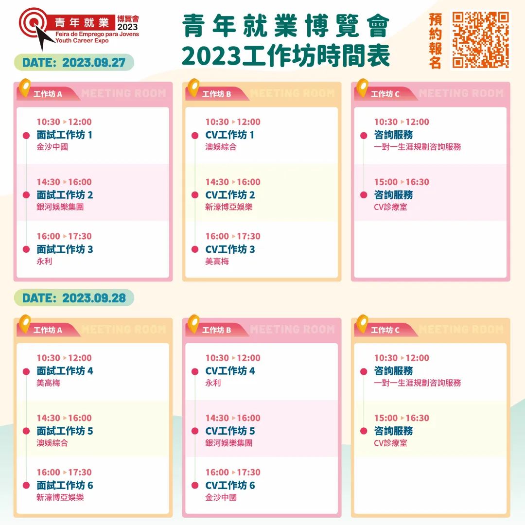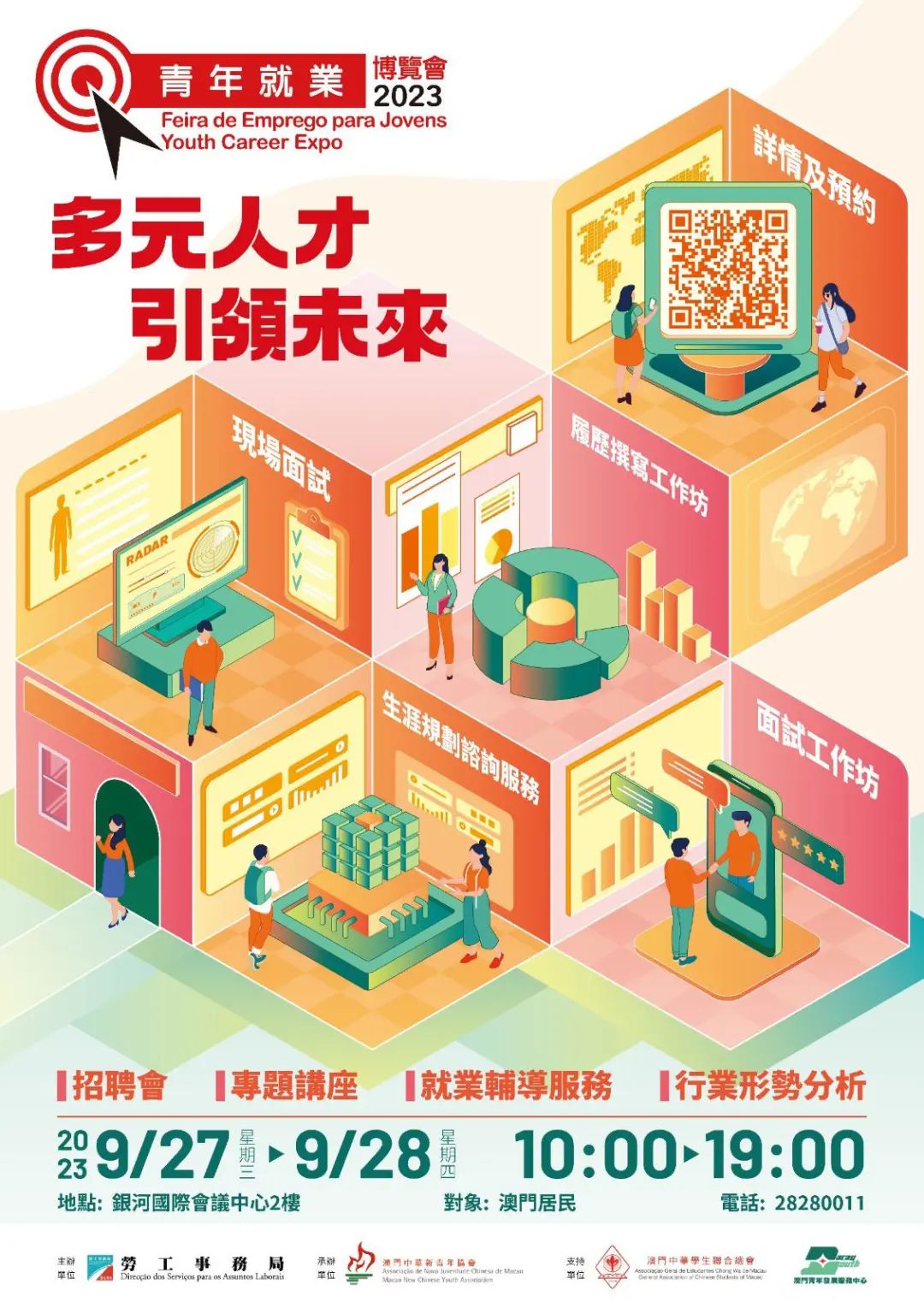 由澳門勞工局主辦、澳門中華新青年協會承辦的“青年就業博覽會2023”,將於2023年9月27日及28日假澳門銀河國際會議中心2樓舉行,今年主題為“多元人才 引領未來”, 活動內容包括大型招聘會、行業專題講座、政策及政府服務宣導以及就業輔導服務。