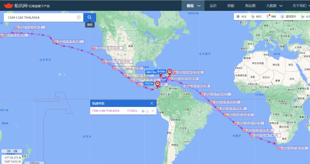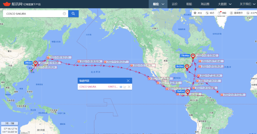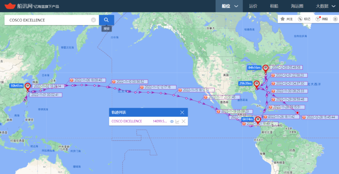 比如,中远海运集运旗下的一艘名为COSCO SHIPPING SAKURA的集装箱船舶,这艘原本服务于海洋联盟”AWE1’航线的超大型集装箱船舶需要经过巴拿马运河并横跨太平洋返回亚洲。但根据船讯网为信德海事网提供的该轮的轨迹信息显示, COSCO SHIPPING SAKURA轮在挂靠纽约和萨凡纳等港口后,该轮目前已经开始横跨大西洋准备经过好望角和新加坡回到中国。此外,服务于’AWE5’航线的中远海运集运旗下的另一艘名为COSCO EXCELLENCE (13092TEU)的集装箱船也采取了类似的绕航方案。与中远海运集运同在一个联盟的达飞轮船旗下的一艘名为CMA CGM THALASSA (服务于‘PEX2’航线)的集装箱船舶也在挂靠完加勒比一系列港口后选择从跨大西洋返航亚洲,目前即将抵达好望角。通过上述绕航,既能优化运力,也能节约成本,还能提高船舶的碳强度评级,可谓是一举多得。