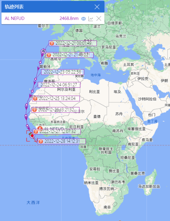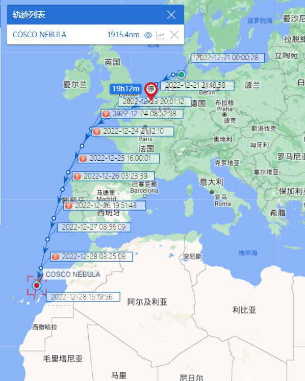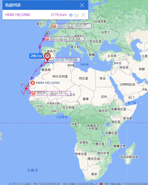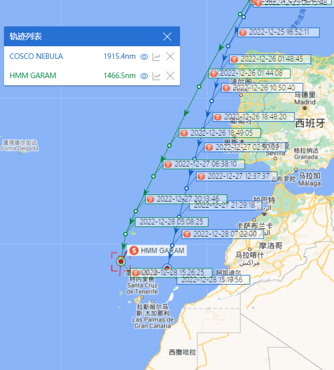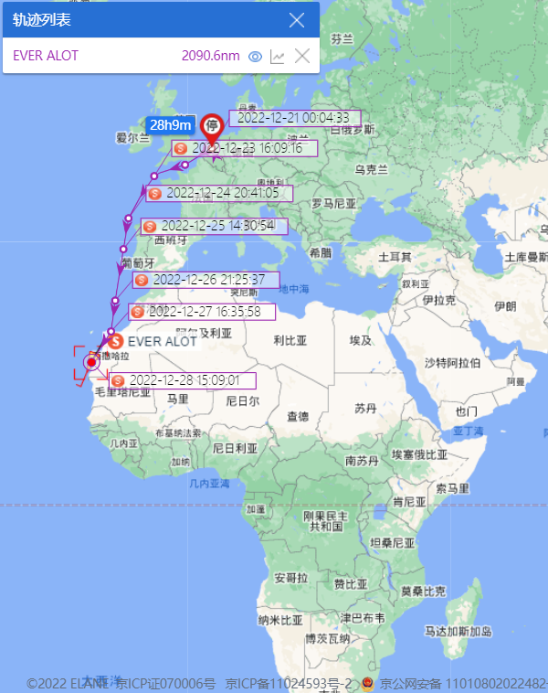 船讯网为信德海事网提供的船舶AIS轨迹信息显示,19870TEU的AL NEFUD轮已经航行到非洲几内亚湾附近海域。23964TEU的HMM HELSINKI轮也已经开始从非洲大陆南下。目前的世界最大集装箱船,世界上第一艘超过24000TEU的EVER ALOT轮正紧随HMM HELSINKI轮沿着非洲大陆南下。中远海运集运旗下的一艘21237TEU名为COSCO SHIPPING NEBULA也已经放弃了进入直布罗陀海峡,南下抵达了西撒哈拉附近海域。另外,HMM旗下一艘超巴拿马型船舶,HMM GARAM (服务于’FE3’航线)目前和COSCO SHIPPING NEBULA轮处于并驾齐驱的位置。此外,绕航经好望角返回亚洲也不仅仅限于欧亚航线的船舶,越来越多的服务于美东-亚洲航线的集装箱船舶也在回程航程中选择经过好望角返回亚洲。