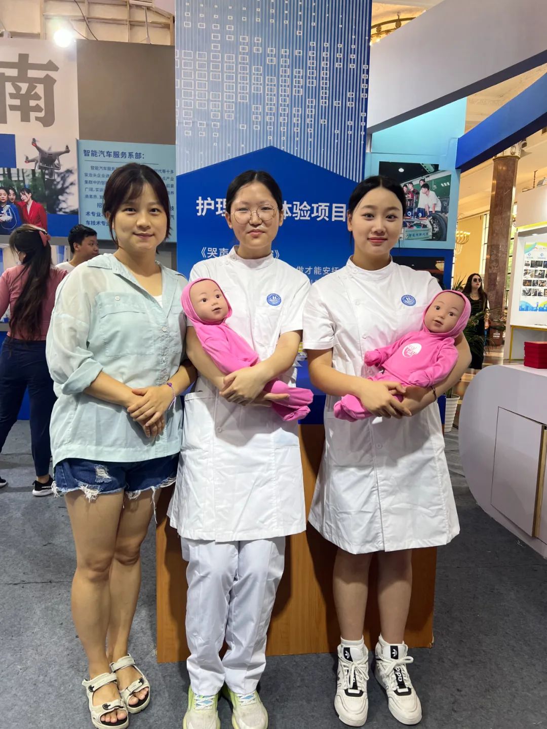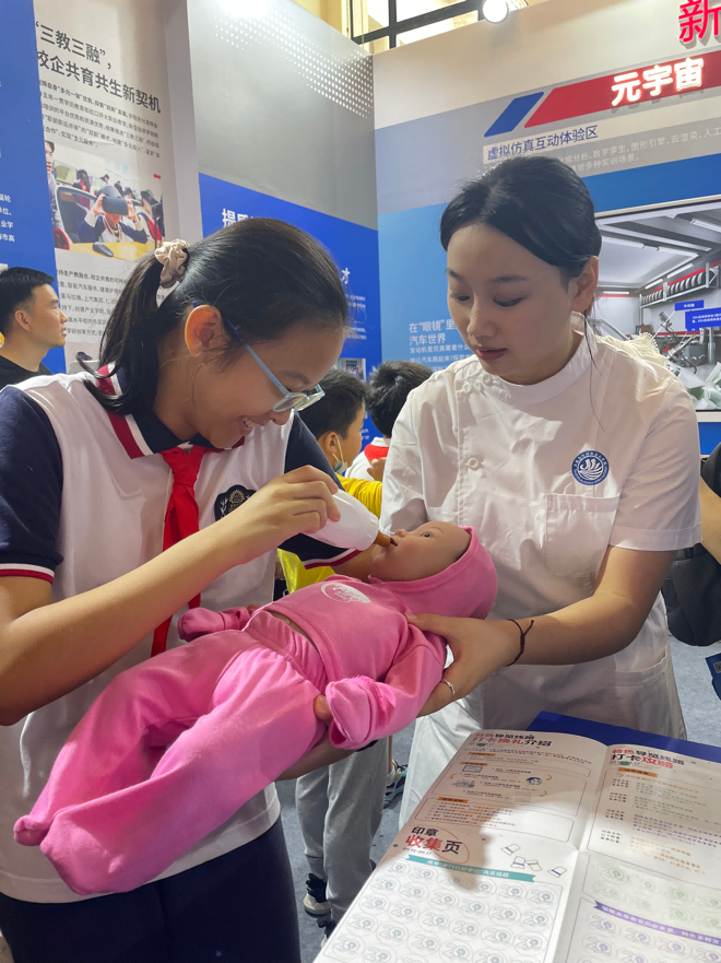 体验项目里的主角“小奶娃”其实是个仿真娃娃,和人类婴儿的体重身量相当。“仿真娃娃的不同哭声代表了不同的生理需求,在学院的专业教学中,同学们可以通过真实场景的模拟来对娃娃进行安抚、喂奶、换尿布等‘回应性照护’。这样虚拟仿真的实训,在有效提升学生操作能力的同时,也培养了他们的爱心和责任心。”南湖职院健康护理系部专业教师戴艺纯在接受采访时讲到。