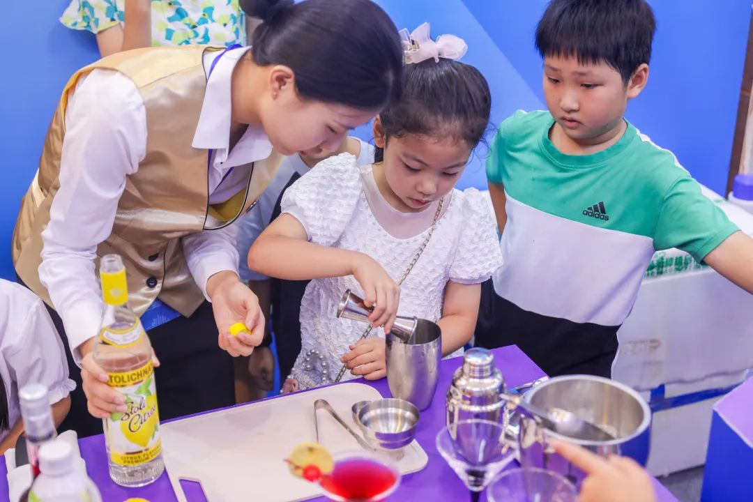 “冰与火”、“春日不迟”、“大都会”......同学们以精湛的手法和高超的技巧调制出一杯杯晶莹剔透的鸡尾酒,为现场的观众带来浪漫的味觉体验。现场还特别为小朋友们准备了无酒精款鸡尾酒,让他们从做、闻、品、鉴等实际操作中体验调酒的乐趣和魅力。