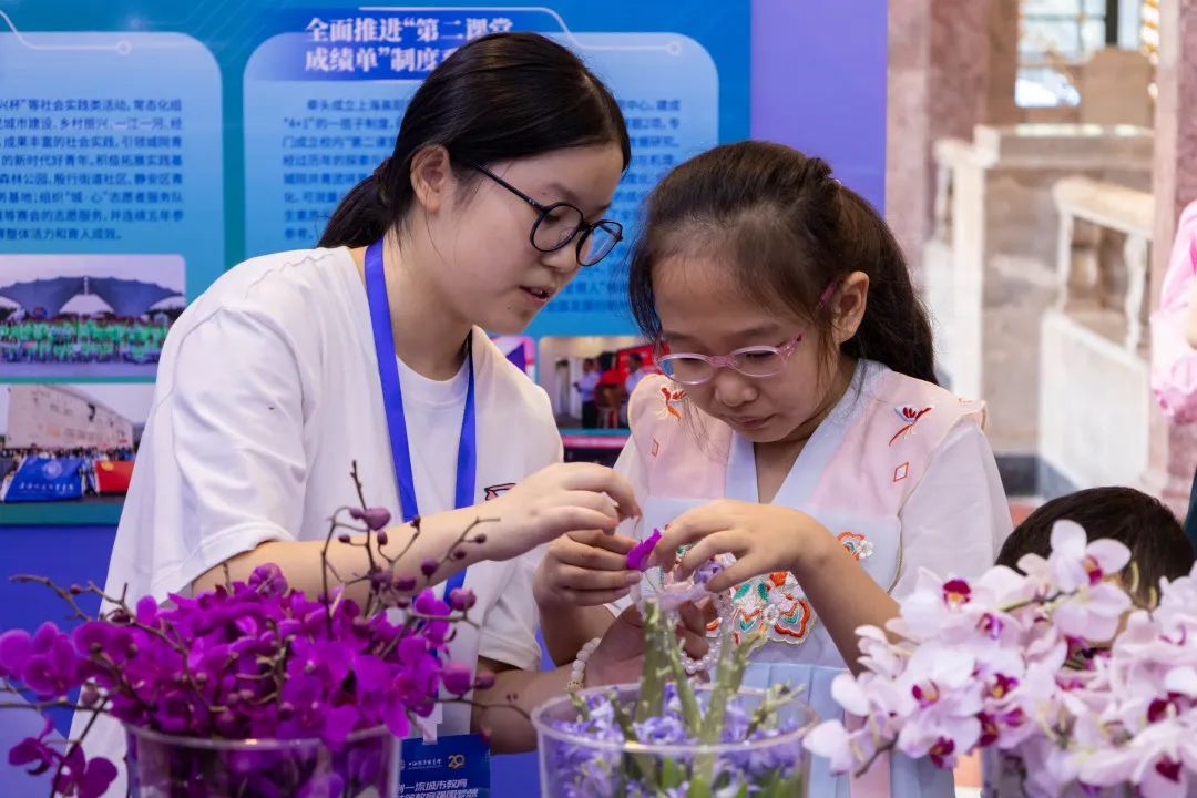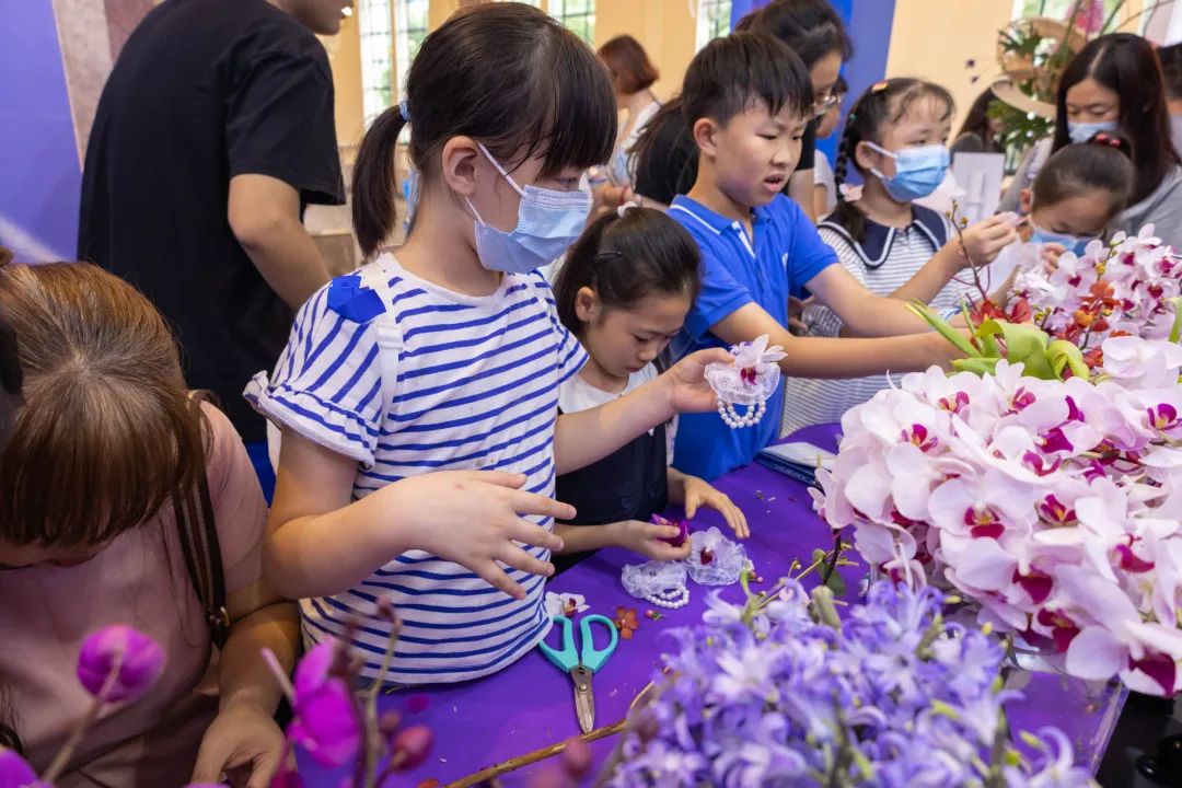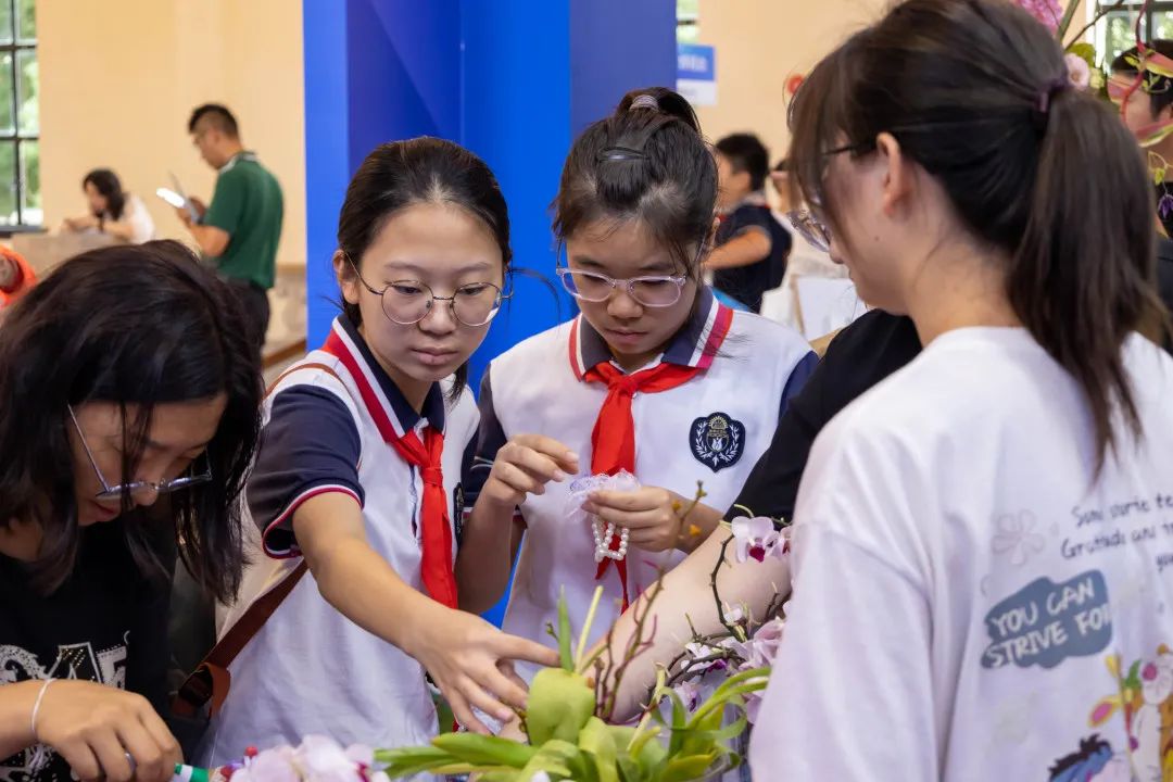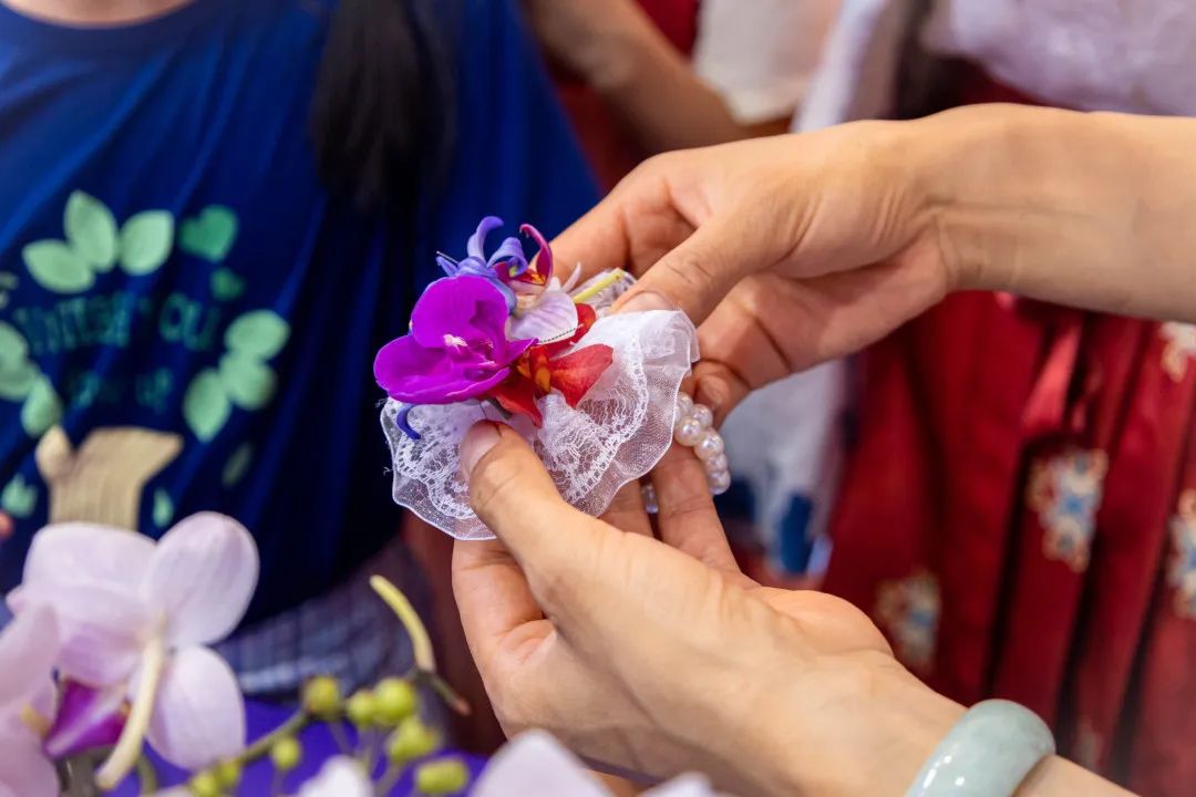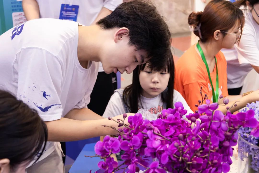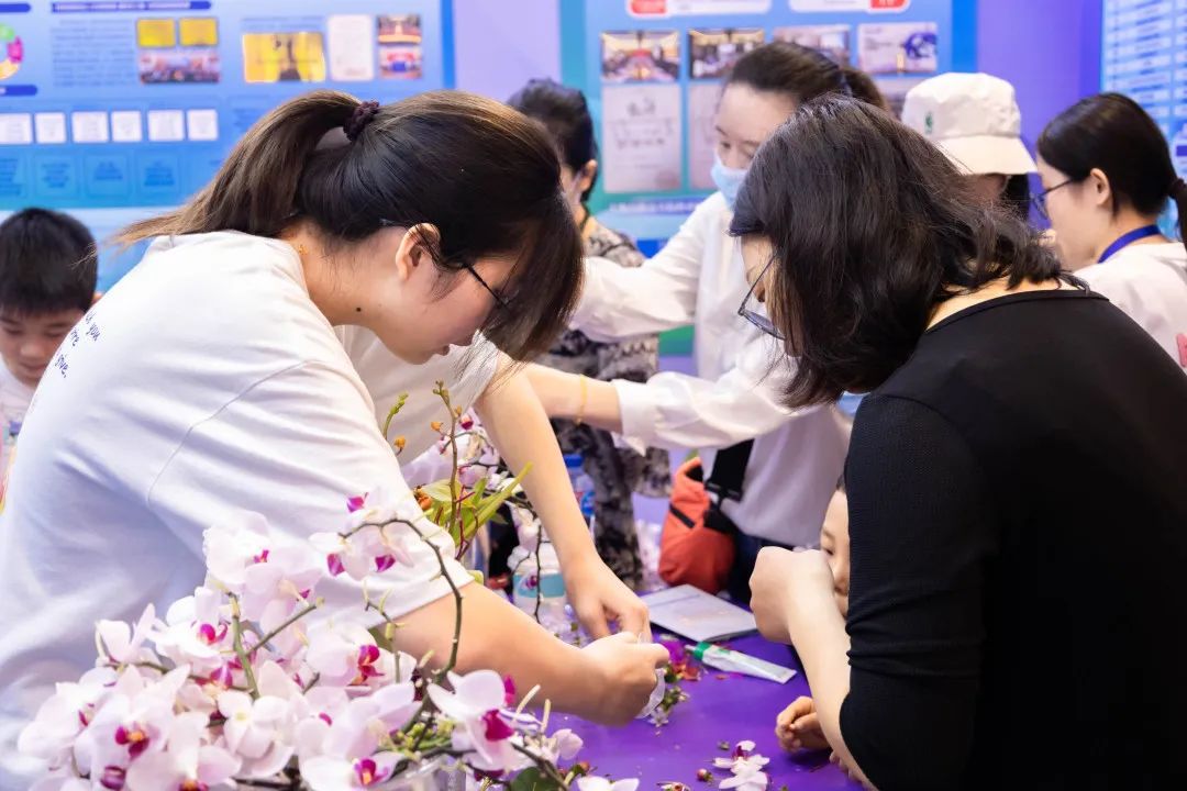 市政与生态工程学院带来的“花艺体验”项目开设了插花展示和花卉手环制作环节。体验项目以粉紫色的蝴蝶兰作为“焦点花”,这款寓意着“高洁、清雅、爱意”的花卉表达了城建师生对学校的深厚感情。