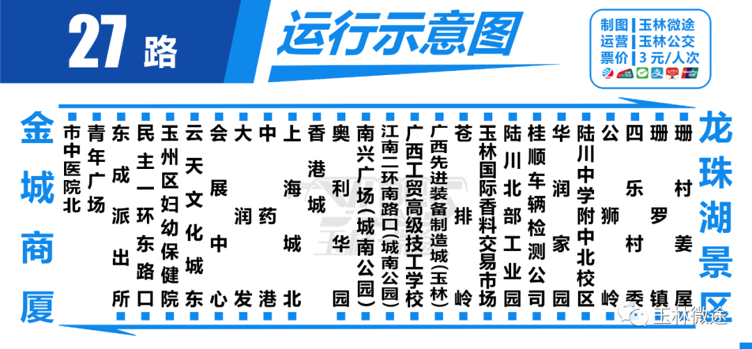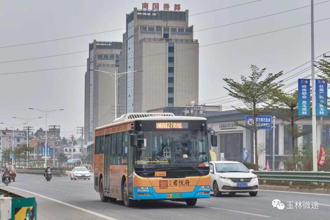 运行线路由原来的民主南路、新民路、江南路…至龙珠湖景区调整为:民主南路、中港路、金港路、万良路、民主南路、新民路、江南路…至龙珠湖景区,调整后乘坐27路车即可从玉林城区直达“两会一展”三个展区。