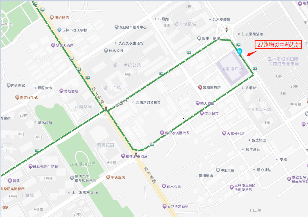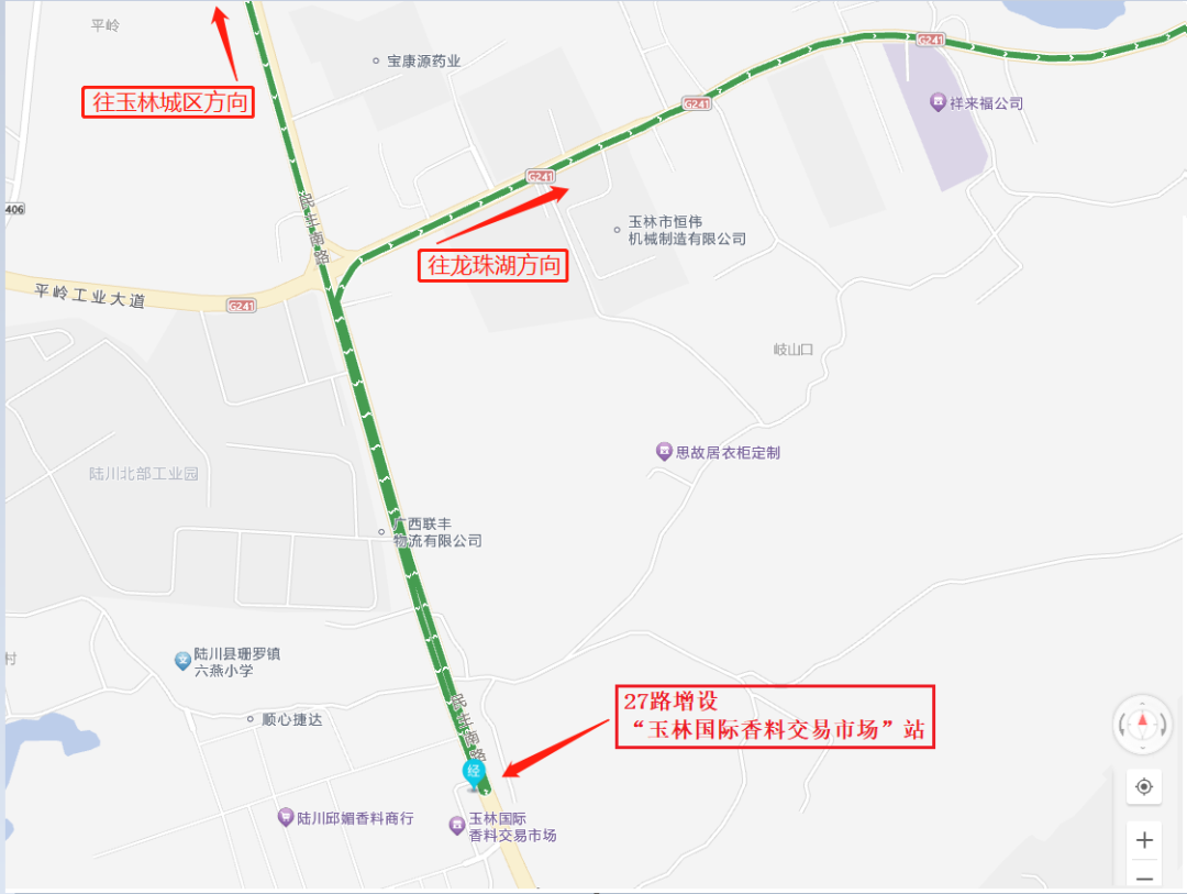 (27路临时增设“玉林国际香料交易市场”站区间线路走向)