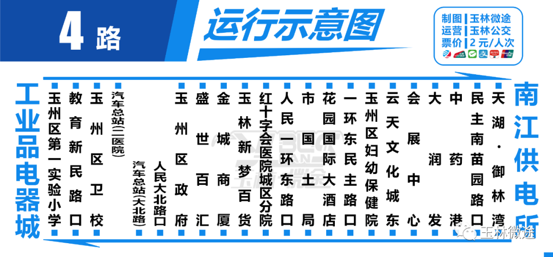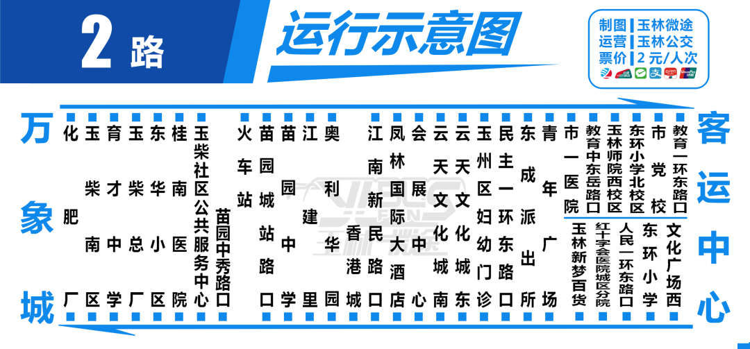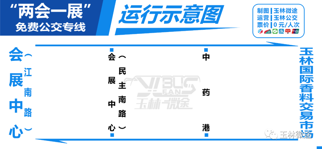 (二)线路停靠站点:会展中心(江南路站)、会展中心(民主南路站)、中药港市场、玉林国际香料交易市场。(三)线路运营计划:线路运营车辆4辆,每辆车每天运行12趟,班次发班间隔时间20-30分钟,服务时间8:00—18:00。(五)可接驳公交线路:2路、4路、5路、8路、18路、27路、大容山旅游专线。