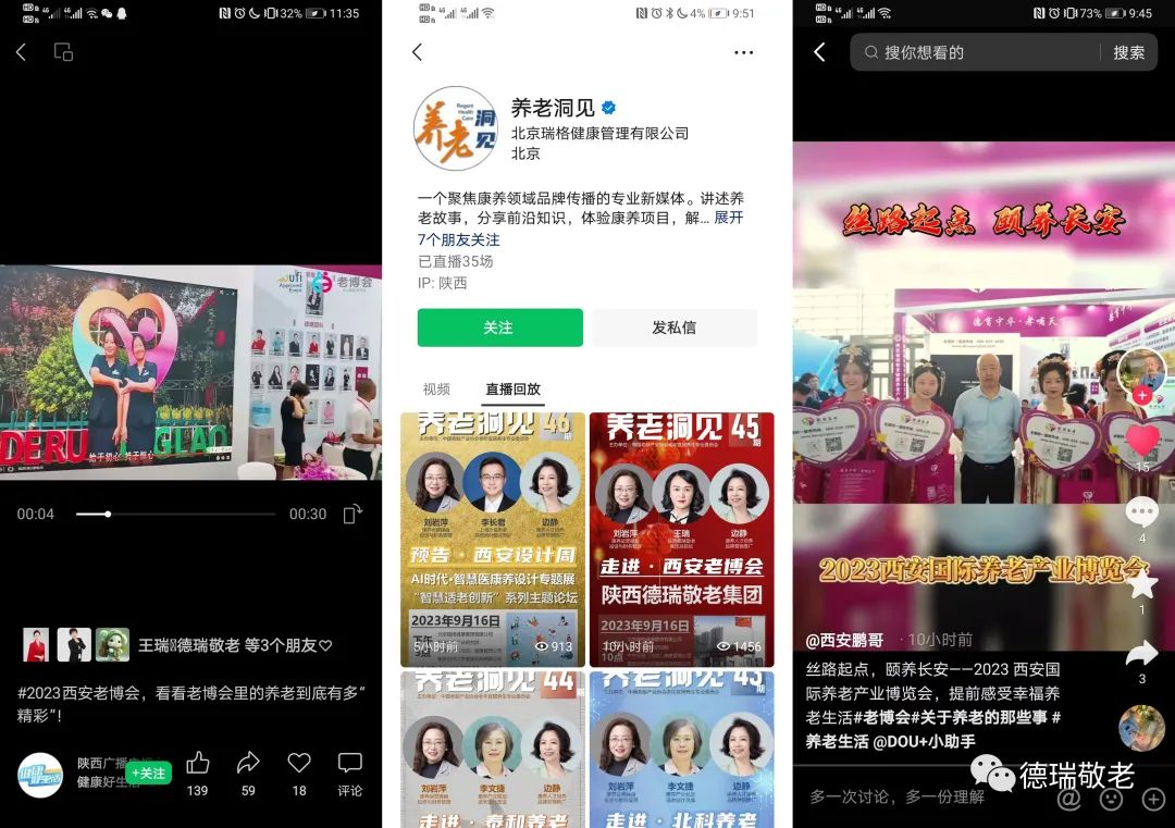 展会期间,德瑞敬老线上采用官方账号对大会盛况和各院经营模式和院内特色进行同步直播。线下穿着唐装小姐姐通过与参观观众互动的方式,使得德瑞敬老品牌获得到访者积极关注,不少长者和意向客户现场咨询,同时此次老博会,受到了央视主流媒体、陕西广播电视台、北京瑞格健康管理有限公司《养老洞见》栏目及抖音知名博主的报道和宣传,进一步提升了德瑞敬老品牌影响力。