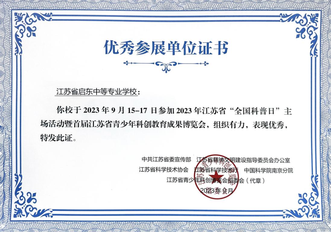 这次启东中专获得优秀参展单位的荣誉,是对学校在科技创新教育方面的努力和成果的肯定,也是对启东市科创教育的鼓舞和激励。希望未来有更多的中小学校能够参与到这样的活动中来,共同推动江苏省青少年科技创新教育的发展。