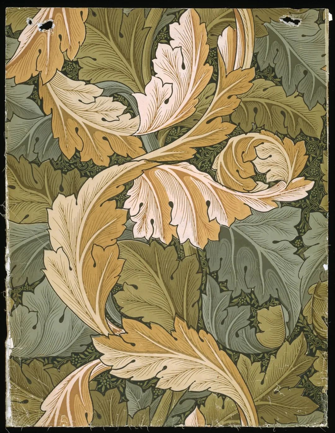 “茛苕”(gèn tiáo)壁纸样本,约1875年,纸本木刻套色画,莫里斯公司制造,V&A博物馆。