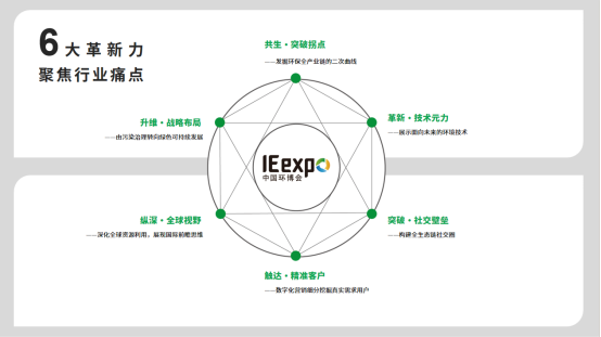 为适应当前的发展形势,中国环博会IE expo将持续推进六大能力的自我革新,即:一、拓展数智化等跨界产业与传统环保产业的共融交集,提升平台“共生力”,发掘环保全产业链内的发展第二曲线;二、由污染治理转向绿色可持续发展,培育在碳中和领域的战略布局,提升平台“升维力”;三、展出面向未来的环境技术,提升平台“革新力”,提升环保科技创新动能;四、深化IFAT全球资源的利用,展现国际前瞻思维,提升平台“视野力”;五、创造平台打破创新链、产业链、资金链、人才链的融合壁垒,提升平台“社交力”;六、深化数字营销体系,配合发起关键营销战役,精准聚拢真实需求用户人群,提升平台“触达力”。