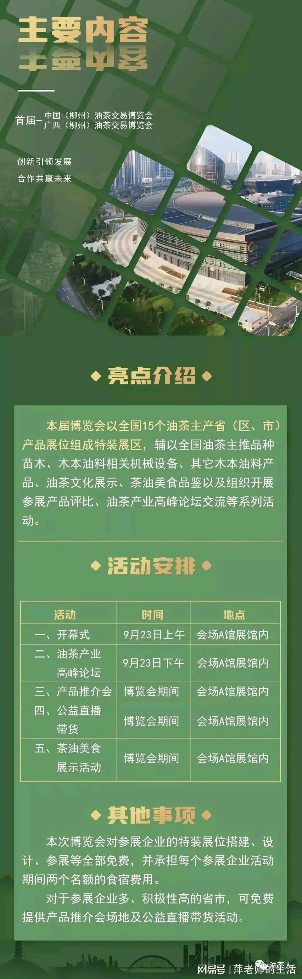 开幕式后的整个展期,博览会的看点非常多,除了五大类展现内容:加工产品展销、油茶文化展现、良种种苗展销、茶油美食体验、机械设备展销以外,还会有打油茶展演、弹奏侗族乐器、唱侗歌等节目,而在美食方面,除了茶油美食以外,还会有各式各样的柳州螺蛳粉展现,无一不体现出柳州热情的民俗风情、多样的美食文化。